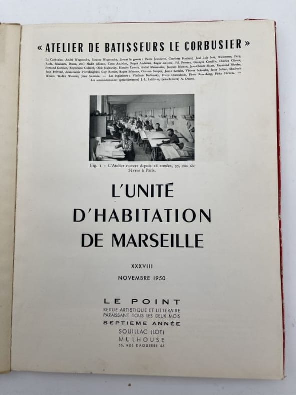 Le Point - Revue artistique et littéraire - n° 38 - novembre 1950 - Souillac (Lot) Mulhouse Le Corbusier - L'unité d'habitation de Marseille - Textes accompagnés de croquis, dessins et photographies (Lucien Hervé, Simone Hermant, Marcel de Renzis, Claudius Petit, Robert Doisneau) - 57 pp. Format 25,5 x 19,5 - couverture cartonnée et jaquette à trois rabats - Bon exemplaire, solide, jaquette usée au dos et dans les coins, plats en très bon état, intérieur frais