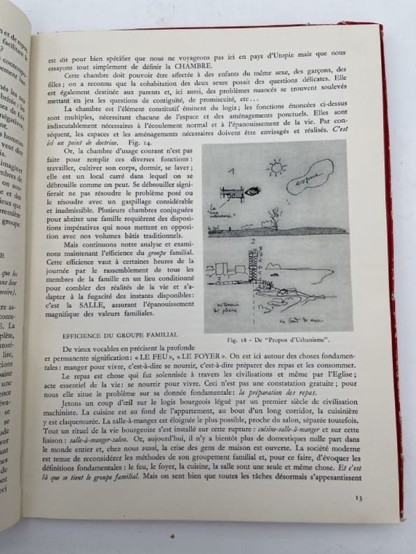 Souillac (Mulhouse-Dornach, impr. de Braun) 1950 In-4 26 x 19 cm. Broché, couverture rouge rempliée, 57 pp., illustrée de 92 reproductions photographiques entre autres de Robert Doisneau, Lucien Hervé, Claudius Petit, Studio Vidal, etc… bibliographie des ouvrages de Le Corbusier. Couverture défraîchie, intérieur en bon état.