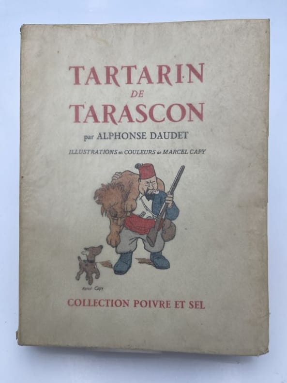 Club des LIbraires de France, 1962 (collection "Fiction"). In-8 (200 X 135 mm) reliure pleine toileblanche, titre marron sous rhodoïd, signet rouge, XXIV-468 pages. En frontispice Daudet vu par Gill, caricature parue dans "l'Artiste", illustré de photographies en noir hors texte. Livres, journaux et estampes ont été photographiés par René-Jacques. La trilogie de Tartarin précédée de l'Histoire de Tartarin par A.Daudet accompagnée de documents réunis pour la première fois sur l'auteur, son personnage et ses sources d'inspiration. Edition au tirage numéroté sur Vélin blanc, maquettes de Pierre Faucheux, exemplaire très frais sans aucune décoloration, excellent état.