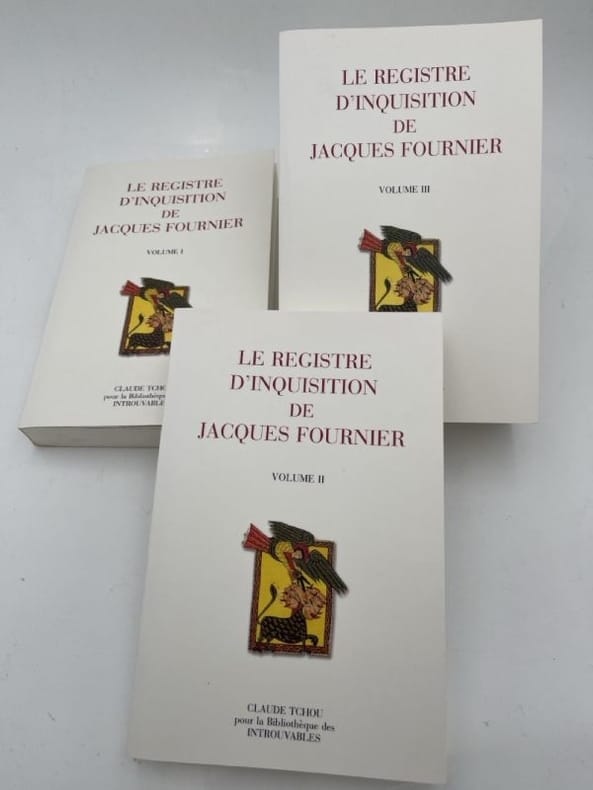 Claude Tchou Claude Tchou, 2004. 3 volumes In-8 brochés de 1346 pages (pagination continue sur les 3 volumes). Photos hors-texte. Collection "Bibliothèque des Introuvables". Superbe réédition intégrale de la célèbre traduction de Jean Duvernoy. Cet ensemble en trois volumes constitue la source historique la plus fascinante sur le monde cathare et la vie quotidienne dans le haut comté de Foix au XIVe siècle. Tome I : Introduction et début des dépositions. Tome II : Suite des interrogatoires.Tome III : Fin du registre, index et tables. Le "Registre de Jacques Fournier" (futur Pape Benoît XII) est un document unique au monde. Contrairement aux comptes rendus inquisitoriaux classiques, il consigne avec une précision quasi-ethnographique les paroles, les croyances, les peurs et les murs des paysans et artisans occitans. C'est à partir de ces pages que l'historien Emmanuel Le Roy Ladurie a rédigé son célèbre best-seller Montaillou, village occitan. On y découvre l'intimité d'une communauté rurale face à l'étau de l'Inquisition, faisant de ce texte un chef-d'uvre de l'histoire des mentalités. Parfait état. Peu courant