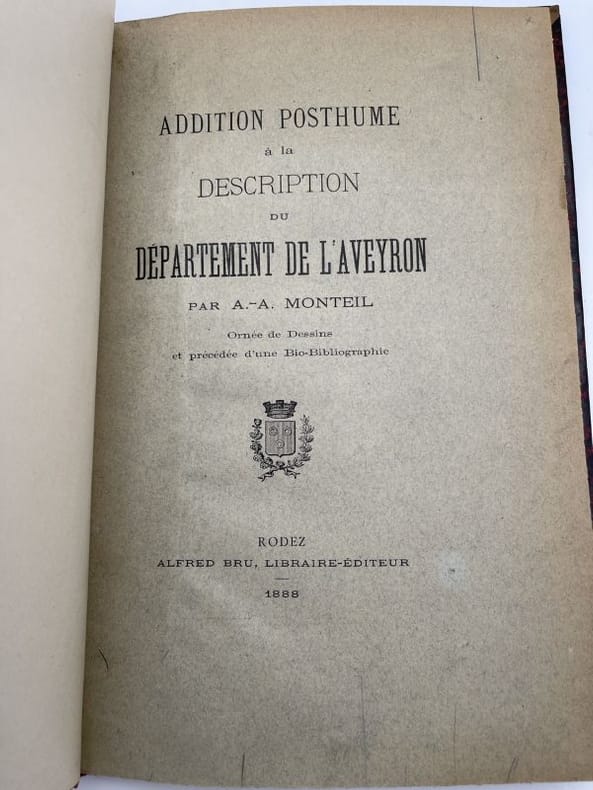 Alfred Bru Rodez Alfred Bru 1888, grand In-8 relié demi basane rouge, dos à nerfs, fleurons et titre dorés, 60 pages . Bien complet des 7 planches hors texte dont la carte, du portrait de Monteil en frontispice et du dépliant regroupant 3 fac-similés. Très bon état. Rare