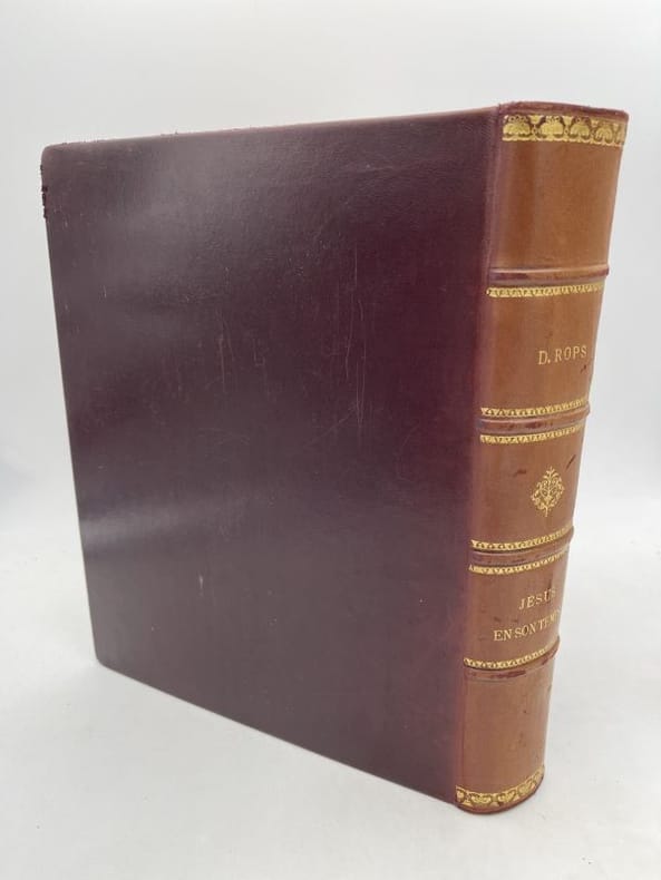 Edition bibliophilique : I imprimé par Coulouma à Paris, un des 200 hors-commerce sur vélin de Rives BFK (N° HC 31), bel envoi “à M. et Mme Delaroche Vernet pour leur souhaiter bon Noël en amical hommage Daniel-Rops décembre 1946”.II imprimé par Chaix à Paris, un des 1400 sur Vélin du Marais (N°463) ; bel envoi “à Monsieur Joseph Belle, en union de foi et d’espérance, cette esquisse du seul Modèle. Daniel-Rops” ; on ajoute : photographie du portrait au crayon à papier de Daniel Rops par Henri de Nolhac daté du 1er juin 1943, avec envoi autographe signé : “à M. J. Belle en souvenir cordial de nos rencontres. Daniel-Rops” et lettre autographe signée plus enveloppe manuscrite à J. Belle, 1 f. in-8 plié en deux, adresse en cachet sec : “8 mai (1946). Cher Monsieur, je serai extrêmement heureux de vous revoir si vous pouvez venir jusqu’à moi lundi 13 à 6 heures du soir. D’avance je vous dis mon très fidèle souvenir Daniel-Rops. Metro Sablons descendre en queue de train rue du marché au bout à droite.”Les quatre volumes sont en parfait état. Seconde partie de l’Histoire Sainte, “Jésus en son temps” fut probablement son plus grand succès de librairie, traduit en plus de quatorze langues, il fut vendu à plus de 500 000 exemplaires, la présente édition étant la plus belle, elle est parue presque en même temps que l’édition ordinaire.