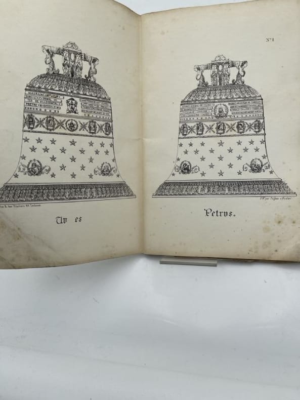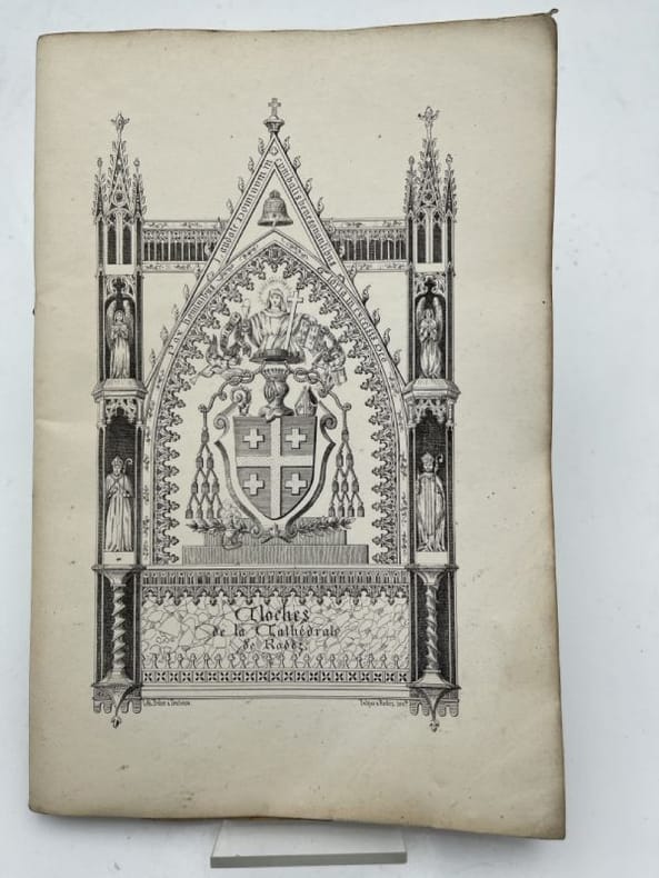 Delor Toulouse, lithographie Delor, sans date, 1843. Plaquette In-8 brochée sous couverture d'attente verte. Lithographies de 9 cloches de la Cathédrale de Rodez à deux faces, soit 18 gravures sous serpentes avec les noms de chacune. Titre dans un bel encadrement. Table explicative des planches en fin d'ouvrage. Tous les dessins sont à l'échelle de 6 cm par mètre. Bibliographie de Couderc Tome II page 358. Légères brunissures en bords des premières planches sans atteinte à la lithographie. Très rare plaquette.