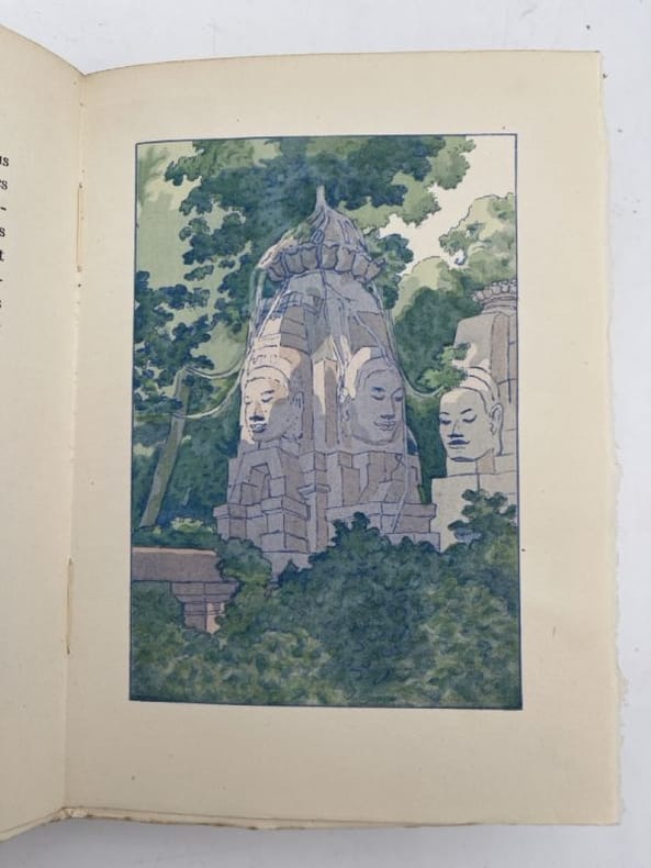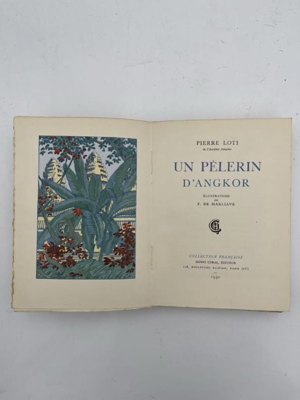 Henri Cyral Paris, Henri Cyral éditeur, 1929. In-8 carré broché, couverture illustrée rempliée de 247 pages illustré de dessin de François de Marliave : un frontispice, des bandeaux, des lettrines et des culs-de-lampe gravés sur bois et finement mis en couleurs au pochoir. Tirage à 1021 exemplaires, celui-ci n° 726 sur vélin de rives. Légères rousseurs sur les tranches, intérieur très frais. Cette édition de 1929 est l'une des plus séduisantes du texte de Loti. Le travail de François de Marliave sur Angkor est particulièrement recherché car il a séjourné sur place, apportant une authenticité rare aux illustrations. François de Marliave, peintre voyageur, restitue avec une grande poésie la majesté des temples khmers et l'atmosphère mystique d'Angkor Thom. Le procédé de mise en couleurs au pochoir (typique des années 20) donne aux illustrations une vibration et une fraîcheur de tons incomparables. Bon état