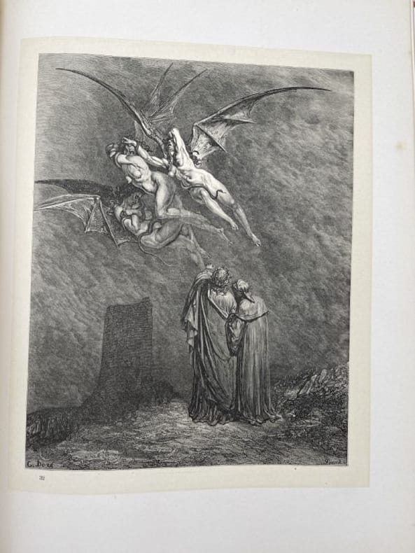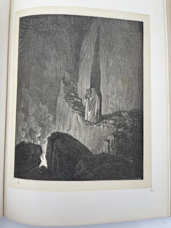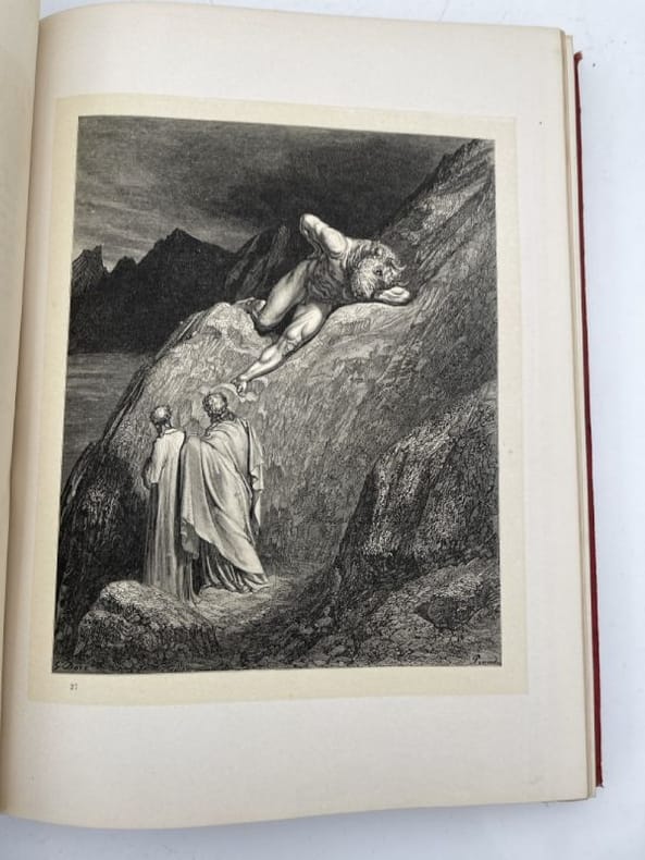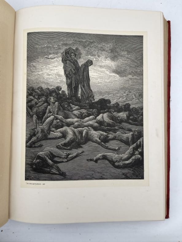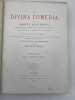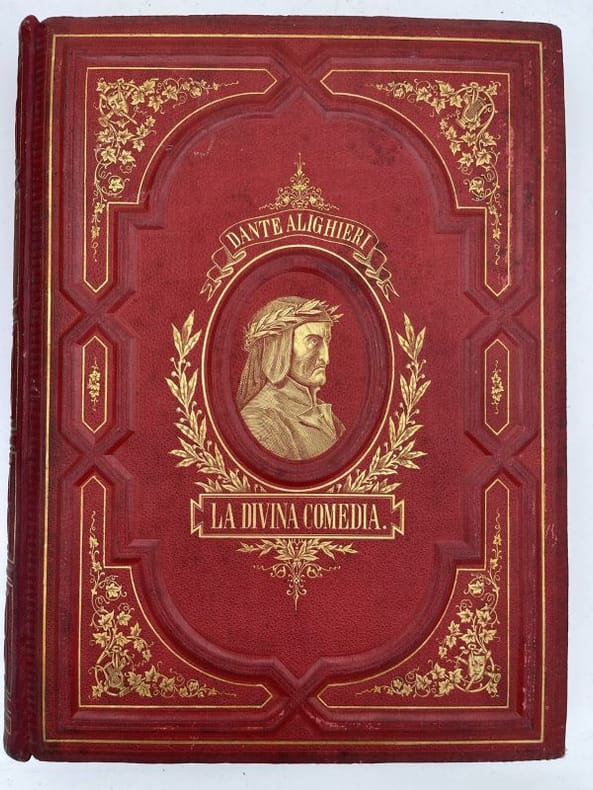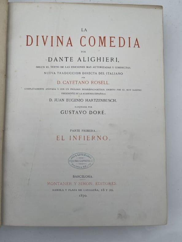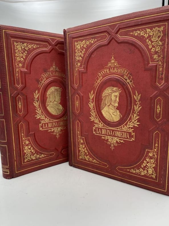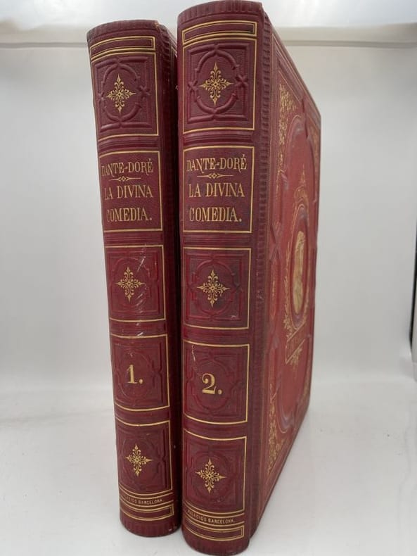 Montaner y Simon Barcelona, Montaner y Simon, 1870 - 1872. 2 volumes In-Folio reliés plein chagrin rouge de l'éditeur. Dos à faux nerfs ornés et estampés à froid. Signature du relieur "Palacios Barcelona" en queue. Premier plat avec titre et décors : portrait de Dante dans un médaillon estampé à froid, fleurons et ornementations aux angles et filets d'encadrement dorés. Second plats décoré estampé à froid. Toutes tranches dorées. XXVI + 232 pages + 1 f.n.ch. + 193 + 190 pages + 1 f.n.ch.Segun el texto de las ediciones mas autorizadas y correctas. Nueva traduccion directa del italiano por D Cayetano Rosell. Completamente anotada y con un prologo biografico-critico, escrito por el muy illustre presidente de la Academia Espanola D. Juan Eugenio Hartzenbusch. Le premier volume contient l'Enfer, le deuxième le Purgatoire et le Paradis. Illustrations de Gustave Doré, hors-texte et sous serpentes légendées. Quelques menus défauts, légères rousseurs par endroits. Les gravures sont bien préservées par les serpentes. Peu courant dans cette reliure éditeur spectaculaire. Bel exemplaire