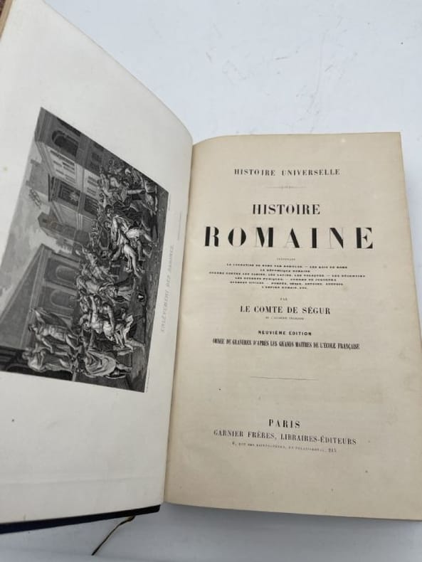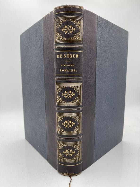 Garnier frères Paris, Garnier frères, vers 1850. Petit In-4 relié demi-chagrin chocolat, dos à nerfs soulignés de pointillés dorés, fleurons et titre dorés. Reliure signée Vidal. Frontispice sous serpente, titre, 738 pages. Neuvième édition ornée de gravures d'après les grands maîtres de l'école française. Contenant : Contenant la fondation de Rome par Romulus - Les rois de Rome - La république Romaine - Guerre contre les Sabins, les Latins, les Volsques - les Décemvirs - Les guerres puniques - Guerre de Jugurtha - Guerres civiles - Pompée, César - Antoine, Auguste - L'Empire Romain, etc. Rousseurs essentiellement de la page 78 à 112. sinon bel exemplaire bien relié