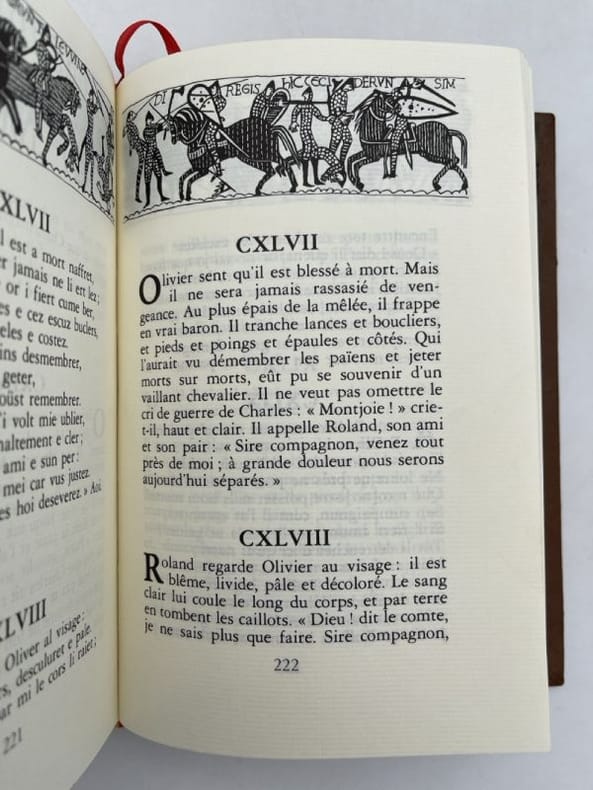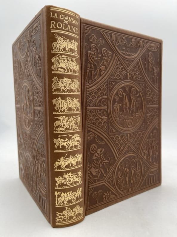 mb.Club du livre Paris, Philippe Lebaud éditeur, 1962. Couverture rigide.les 2 livres sont en tres bon etat et sont dans un coffret, ce dernier est legerement frotte, in-4 , le coffret c'est un emboitage avec le dos de 2 livres. Reliure du livre principale est en pleine cuir marron ornée de cinq clous en laiton sur chacun des plats et d'un décors de croisettes et de losanges entrelacés dans le goût médiéval. Dos à 5 faux nerfs, portant le titre en lettres dorées (19x24 cm)pour les chanson de Roland et l'autre livre a une reliure en pleine cuir marron portant les armoiries de Kenelm Digby sur le plat supérieur. Dos muet à 4 faux nerfs (12x18 cm)pour le manuscrit d'Oxford 72 feuillets. Traduction originale du manuscrit d'Oxford et commentaires de Louis-Robert Plazzolles. L'ouvrage de la chanson de Roland a des enluminures de Jean Gradassi pleines pages. Tranche supérieure dorée. Avec un FACSIMILE du manuscrit de la Bodleian Library d'Oxford reproduisant fidèlement toutes les particularités du manuscrit (irregularités des feuillets, trous.) Le tout conservé dans un LUXUEUX EMBOITAGE legerement abime reproduisant la forme de deux livres factices reliés en peau marron et portant les titres "La chanson de Roland" et "Le manuscrit d'Oxford". Le manuscrit d'Oxford est le plus ancien manuscrit de chanson de geste qui nous soit parvenu (XIIème siècle). Il s'agissait probablement d'un modeste volume à l'usage d'un jongleur chargé de réciter ou chanter ces vers. Il fut offert au XVIIème siècle à la Bodleian Library par Kenelm Digby, philosophe brillant et fantasque, et ami de Descartes.photos possibles