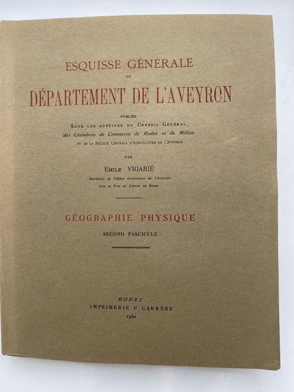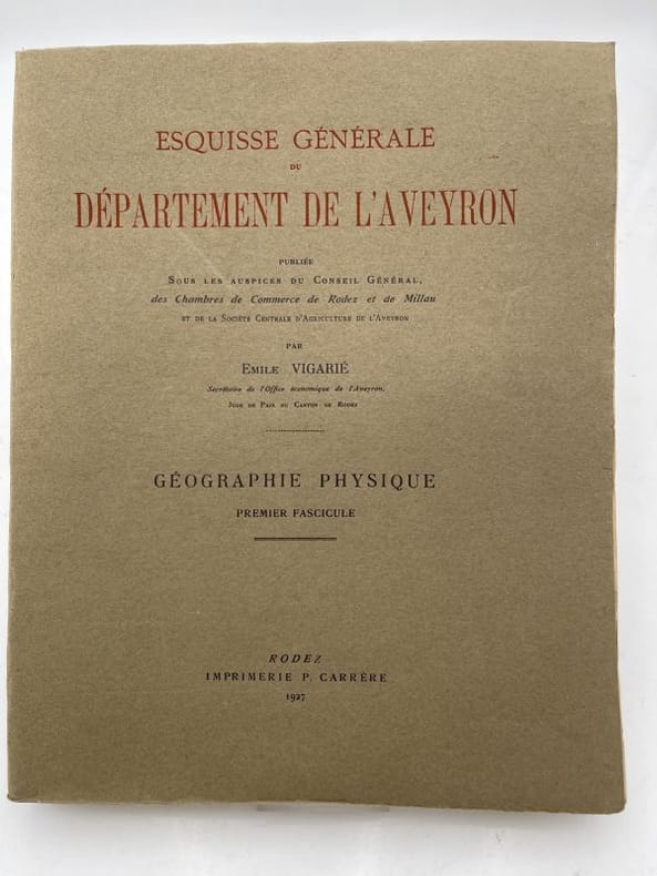 Carrère Rodez, Imprimerie Carrère, 1927 - 1930. 2 volumes In-4 brochés de xx + 487 pages non coupées (pagination suivie sur le deux volumes). Cartes et photos en hors texte. Pages non coupées. Le 1° volume : Géologie, orographie, hydrographie, eaux souterraines, faune. 2° volume : Flore, agrologie, forêts, météorologie, matières premières du sous sol, ethnographie. Exemplaire bien complet des deux volumes. Très bon état.