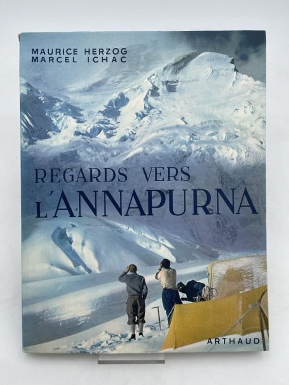 B. Arthaud 1951 96 pages in8. 1951. reliure éditeur. 96 pages. Regards vers l'Annapurna est un album de photographies et un témoignage de l'expédition française victorieuse de 1950 première ascension réussie d'un sommet de 8000 mètres (l'Annapurna). L'ouvrage préfacé par Lucien Devies rassemble les clichés des membres de l'expédition dont Maurice Herzog Gaston Rébuffat et Louis Lachenal. Il documente cette aventure historique et ses conséquences comme les graves gelures subies par le chef d'expédition
