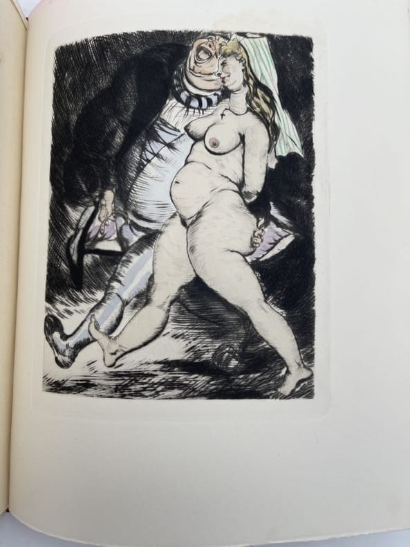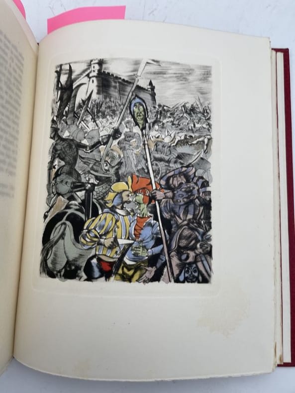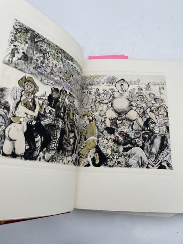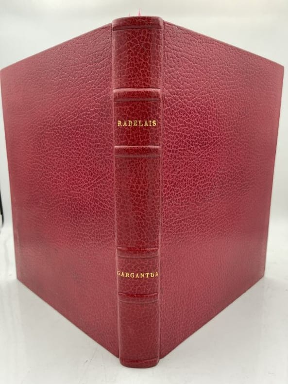 Editions KRA, 1931 ; Ouvrage illustré par Dubout avec une mise en couleur original signée pour indication coloriel ! "Illustration d'une grande originalité", Carteret IV. Ouvrage très bien relié.N° 728/1000. Reliure signée. Deuxième roman de François Rabelais. Il conte les années d’apprentissage et les exploits guerriers du géant Gargantua. Plaidoyer pour une culture humaniste contre les lourdeurs d’un enseignement sorbonnard figé, Gargantua est aussi un roman plein de verve, d’une grande richesse lexicale et d’une écriture souvent crue, volontiers scatologique. Immédiatement, le nouveau-né mort de soif réclame « à boyre ». Surpris et amusé par une telle soif, Grandgousier, son père, s’exclame : « Que grand (gosier) tu as », ce qui vaudra à l’enfant d’être appelé Gargantua.