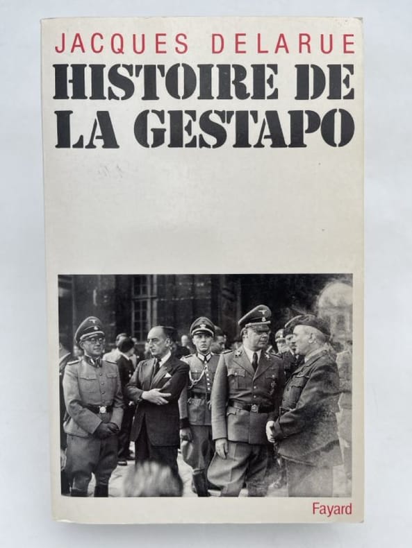 Paris, Fayard, coll. « Les grandes études contemporaines », (6 décembre) 1962 1 vol. (135 x 220 mm) de 472 pp., [3] et 1 ff. Broché. Édition originale. Exemplaire poinçonné du service de presse. Envoi à Jean Desborde, journaliste à Vichy (où travaille Delarue) : « Pour Monsieur Jean Desborde,/cette /Histoire de la Gestapo (ici le titre)/, en hommage respectueux/de l'auteur/Delarue ».