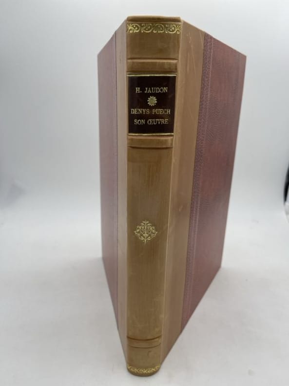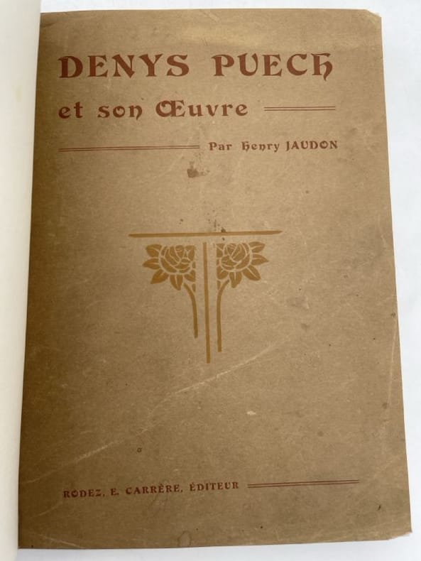 Carrère Rodez Carrère 1908, In-folio relié demi-basane blonde, dos à nerfs, pièce de titre de cuir brun, liserés et fleurons dorés, plats de papier marbré imitant la peau de reptile, gardes de papier marbré, couverture conservée. 271 pages, imprimées sur beau papier glacé, Photo de Denys Puech en frontispice par Braun-Clément, photos dans le texte et hors texte sous serpentes légendées. Avec un catalogue des oeuvres de Denys Puech en fin d'ouvrage. Belle reliure. Très bon état