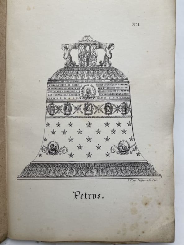 Delor Toulouse, lithographie Delor, sans date, 1843. Plaquette In-8 brochée sous couverture d'attente verte. Lithographies de 9 cloches de la Cathédrale de Rodez à deux faces, soit 18 gravures sous serpentes avec les noms de chacune. Titre dans un bel encadrement. Table explicative des planches en fin d'ouvrage. Tous les dessins sont à l'échelle de 6 cm par mètre. Bibliographie de Couderc Tome II page 358. Légères brunissures en bords des premières planches sans atteinte à la lithographie. Très rare plaquette.