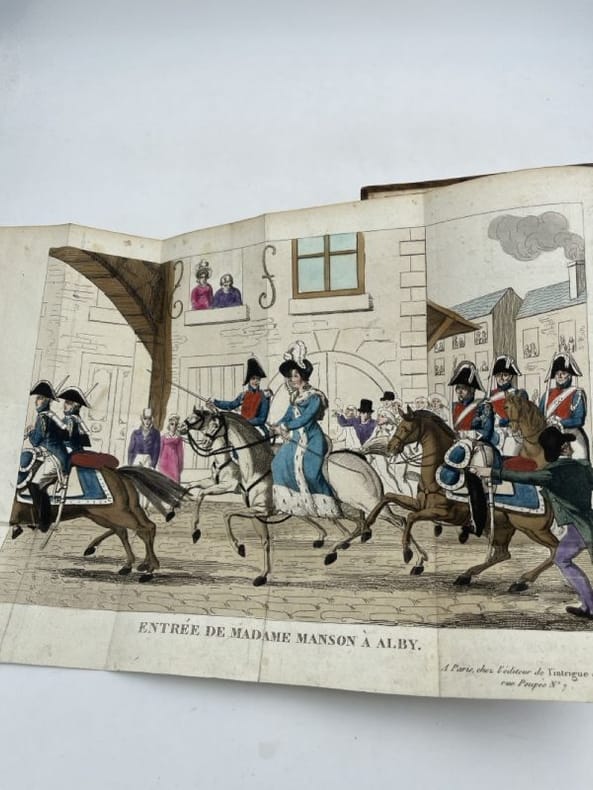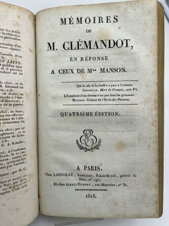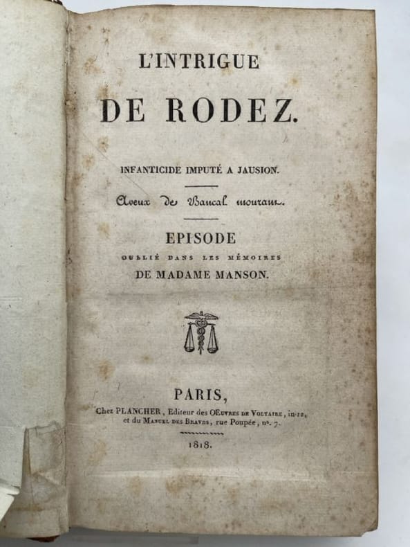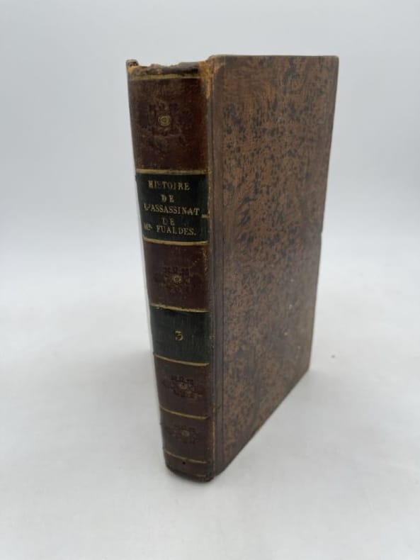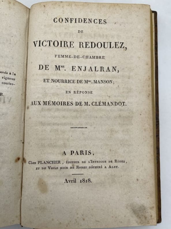 Plancher Paris chez Plancher, 1818. In-8 relié demi basane brune, dos lisse à fleurons estampés et froids et dorés, pièce de titre. 252 pages. Grande gravure en couleur dépliante en bon état, 38 x 24,5 cm, légendée "Entrée de Madame Manson à Alby", et deux planches de 4 portraits en médaillon : Mr Fualdès, Mme Manson, Bastide, Jausion - Relié en suivant "Mémoires de M. Clémandot, en réponse à ceux de Mme Manson" A Paris chez Ladvocat 1818, 107 pages - Suivi de "Confidences de Victoire Redoulez, femme de chambre de Mme Enjalran, et nourrice de Mme Manson; en réponse aux Mméoires de M. Clémandot", A Paris Chez Plancher, Avril 1818, 84 pages. La reliure est un peu frottée sans gravité, chiffre de tomaison 3 en dos. Ex-libris manuscrit Carrère. Rousseurs éparses essentiellement sur le premier titre.Très bon ensemble sur cette célèbre et mystérieuse affaire criminelle qui défraya la chronique au tout début du XIXe siècle et bien au delà des frontières.