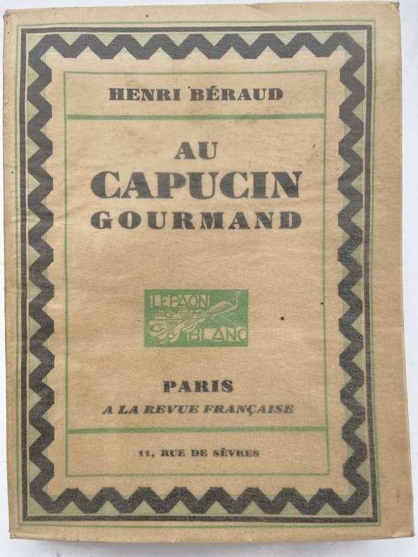 Paris. Albin Michel. 1925. In-12 (128 x 192 mm) cartonnage bradel, couverture imprimée entièrement conservée (lgt poussiéreuse), 254 pages. Édition originale tirée à 450 exemplaires, celui-ci n°66 un des 300 sur papier vergé pur fil Vincent Montgolfier. Séduisante reliure d'amateur, décor du 1er plat entièrement composé de papiers de couleurs diverses, agencés de manière à former un paysage dans lequel figure l'enseigne du Capucin gourmand. Petit dessin mosaïqué sur le 2éme plat. Bel exemplaire. Photo sur demande.