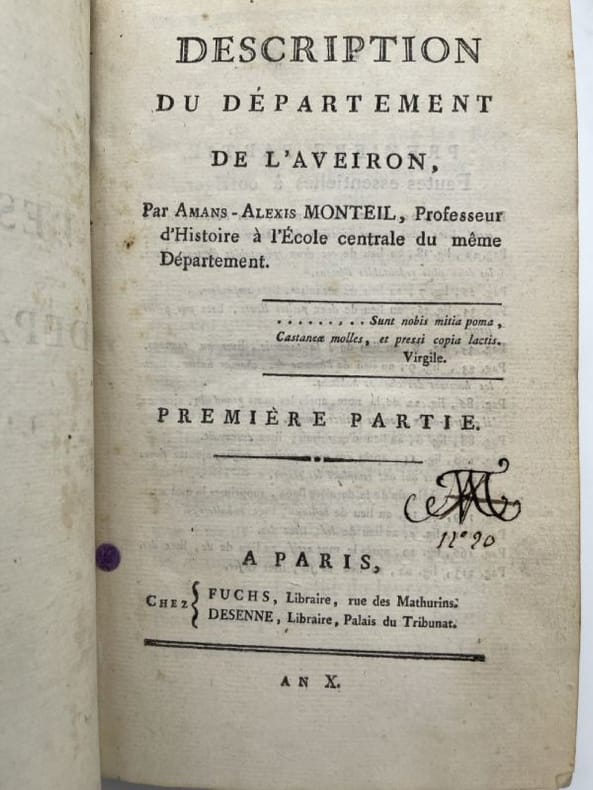 Fuchs A Paris, chez Fuchs, an X. In-8 relié demi basane brune, dos lisse à filets dorés, piéce de titre rouge. Deux parties en un seul volume. VIII + 220 + 284 pages. Bien complet des 6 planches hors texte, certaines dépliantes et de la carte de l'Aveyron. La reliure est abimée, deux planches sont un peu abimées aux pliures sans grande gravité. Le corps de l'ouvrage est en bon état. Ce rare ouvrage, ici en édition originale, mériterait une reliure.