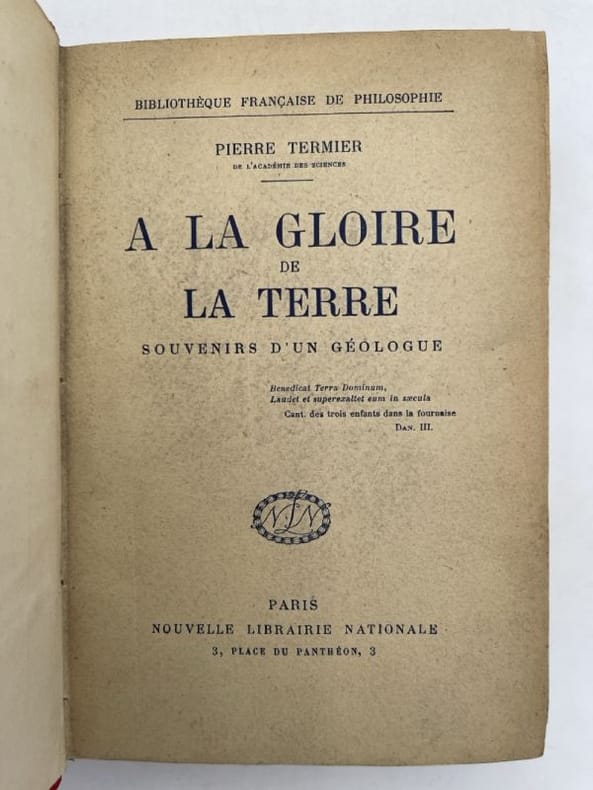 Paris Desclée de Brouwer 1931 in 8 (20,5x13,5) 1 volume broché, 333 pages [1]. Pierre Termier, Lyon 1859 - Grenoble 1930, géologue français, spécialiste de la tectonique. Bibliothèque française de philosophie. Bel exemplaire ( Photographies sur demande / We can send pictures of this book on simple request )