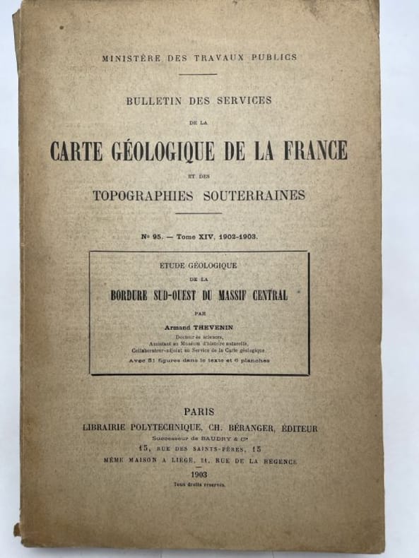 Librairie Polytechnique Paris, Librairie Polytechnique, 1903. Grand In-8 broché, 202 pages. N°95 des bulletins des services de la carte géologique de la Frace et des topographies souterraines. Avec 51 figures dans le texte et 6 planches se décomposant comme suit : Carte dépliante en couleurs au 1/200.000e, carte hypsométrique de la bordure s.o. du Massif Central. Poche à phosphorite de Raynal près Saint Antonin, Poche à phosphorite du Causse de Caylus. Vue de Saint Antonin, Planche dépliante, vue panoramique du bassin d'effondrement d'Asprières et de la faille de Villefranche , depuis Naussac. Le dos est abimé et fragile, le corps de l'ouvrage est en bon état. Peu courant.