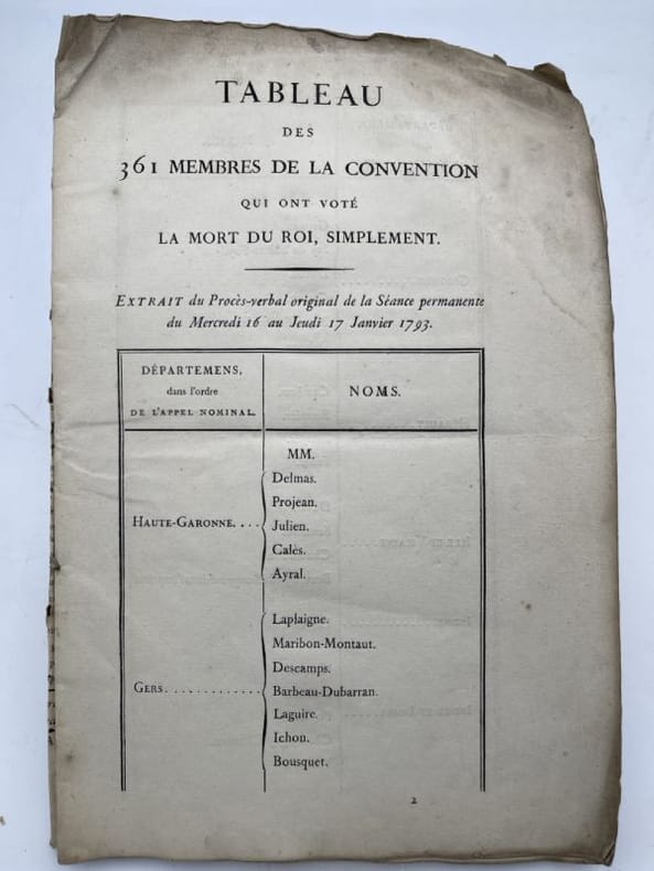 Sans Sans Editeur, sans lieu, 1816. Grand document au format In-4 sans couverture, 28 pages. La page de couverture et la dernière sont défraichies en bords et brunies, sans perte de texte. L'intérieur sous forme de tableau est en bon état. Il s'agit de l'Extrait du Procès-verbal original de la séance permanente du mercredi 16 au jeudi 17 janvier 1793. Le mot "simplement" dans le titre veut dire vote de la mort sans condition. Dans l'ouvrage figure également un tableau de ceux qui ont voté la mort du Roi en demandant une discussion sur la question de savoir s'il conviendrait à l'intérêt public qu'elle fût ou non différée et un tableau de ceux qui ont voté la mort avec sursis, soit après l'expulsion des Bourbons, soit à la paix, soit à la ratification de la Constitution. On notera des précisions fort intéressants sur les raisons des votes en dernière page. Édition réalisée pendant la Restauration : Ces listes ont été massivement réimprimées après le retour des Bourbons. L'objectif était alors de désigner les "Régicides" pour les exclure de la vie publique (loi d'amnistie de 1816 qui condamnait les régicides à l'exil). Rare document.