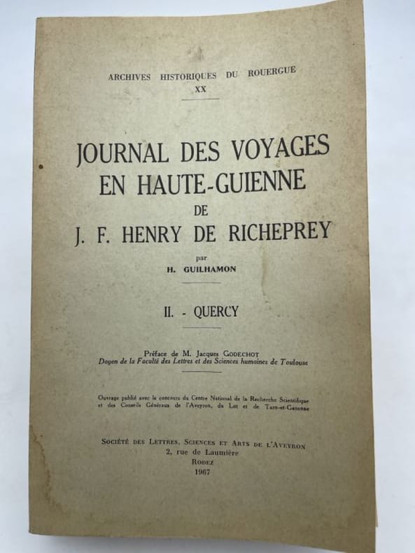 Rouergue Archives Historiques du Rouergue 1967, grand et fort In-8 relié demi basane blonde, dos à nerfs, filets, fleuron et guirlande dorés, gardes de papier marbré, couverture conservée. 559 pages. Avec index. Préface de Jacques Godechot. Ouvrage du plus grand intêrét, véritable état des lieux du Quercy à la veille de la Révolution. Renseignements multiples touchant a peu près tous les secteurs de l'activité humaine. J.F. Henry de Richeprey avait été envoyé en Guyenne pour en inspecter les cadastres et en ordonner, le cas échéant, la réfection. Une mine de renseignements pour les recherches d'histoire sociale et agraire. Tirage limité à 500 exemplaires. Tome II : Quercy seul. Bel exemplaire dans une belle reliure. Très bon état