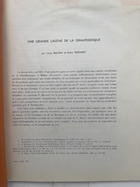 Gallia Gallia, 1971. In-4 sous couverture d'attente, tiré à part de la revue Gallia, xxix, 1971. 35 pages, avec figures et photos. Trace d'humidité en partie supérieure sans grande gravité. Envoi autographe de Louis Balsan à l'éditeur de Rodez, Pierre Carrère. Bon exemplaire