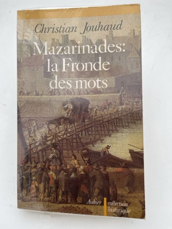 Aubier Aubier, 1985. In-8 broché (22 x 13,5 cm) de 287 pages. Collection "Historique". Christian Jouhaud propose ici une étude sur les "Mazarinades", ces milliers de pamphlets et libelles publiés durant la Fronde. L'auteur analyse comment l'écrit devient une arme politique et comment la manipulation du langage transforme la révolte en un véritable champ de bataille sémantique. À travers une analyse rigoureuse des textes et de leurs circuits de diffusion, l'ouvrage explore les rapports entre littérature, opinion publique et pouvoir au XVIIe siècle. Ce travail pionnier de l'histoire culturelle et politique démontre comment la "guerre des mots" a durablement marqué l'histoire de la monarchie française. Papier légèrment jauni sinon Bon état