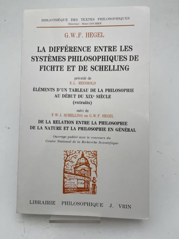 Vrin Vrin, 1986. Collection « Bibliothèque des Textes Philosophiques ». In-8 (broché), 21,5 x 13,5 cm. Présentation et traductions par Bernard Gilson. Précédé de K.L. Reinhold : « Éléments d'un tableau de la philosophie au début du XIXème siècle (extraits)» et suivi de F.W.J. Schelling ou G.W.F. Hegel : « De la relation entre la philosophie de la nature et la philosophie en général ». Publié initialement en 1801, ce texte (souvent désigné sous le titre de Differenzschrift) marque la première intervention publique d'envergure de Hegel dans le champ de la philosophie. Dans cet écrit de jeunesse, Hegel entreprend une critique serrée du "subjectivisme" de Fichte tout en prenant parti pour l'identité absolue telle que formulée à l'époque par Schelling. C'est un ouvrage fondateur qui pose les jalons de la dialectique hégélienne et préfigure les grands développements de la Phénoménologie de l'Esprit. Traces de scotch ancien au verso de la couverture sinon bon état