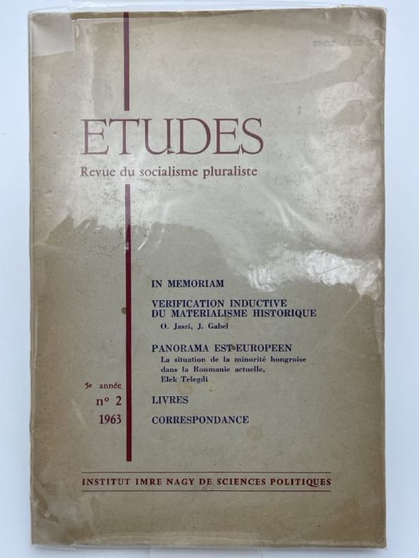 Paris, Etudes 1963. In Paris, Etudes 1963. In-8 broché de 119 pages. La résolution de Juin. Le général de la révolution. Esquisse d'un portrait de Miklos Gimes. Joseph Szilagyi. Geza Lonsonczy. Vérification inductive du matérialisme historique. Durkheimisme et socialisme. La situation de la minorité religieuse hongroise dans la Roumanie actuelle.