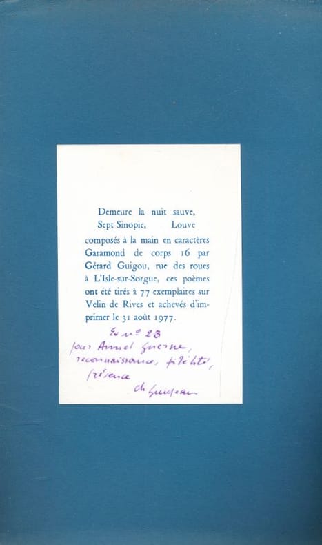 L' isle sur la sorgue L' isle sur la sorgue, 1977. In-8 en feuillets non paginé. Tirage limité à 77 exemplaires, celui ci n° 23 sur vélin de rives avec envoi à ARMEL GUERNE. Edition originale. Dos insolé sinon Bon état