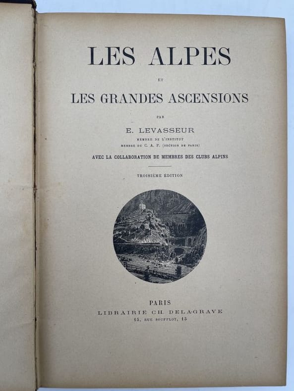5è édition d'un ouvrage publié en 1899 par le géographe et historien Emile LEVASSEUR (1828-1911), "avec la collaboration de membres des Clubs Alpins": géographie physique et humaine des Alpes, suivie de leur description détaillée par chaines, massifs, montagnes, avec l'histoire des ascensions par des membres des Clubs alpins; illustré de gravures (vues) et cartes. Exemplaire remis en prix d'excellence de 2nde au lycée d'Avignon en 1898.