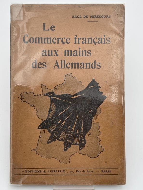 Paris, Editions et Librairie Paris, Editions et Librairie Vers 1950. In-8 broché, couverture illustrée. 95 pages. Passages soulignés. A la conquête de la France; L'espionnage Commercial. L'infiltration allemande en France. Le livre d'or de l'industrie Allemande en France. La grane industrie. Librairie et maison d'édition. Les autres produits allemands. Dans les colonies. D'urgentes mesures à prendre.