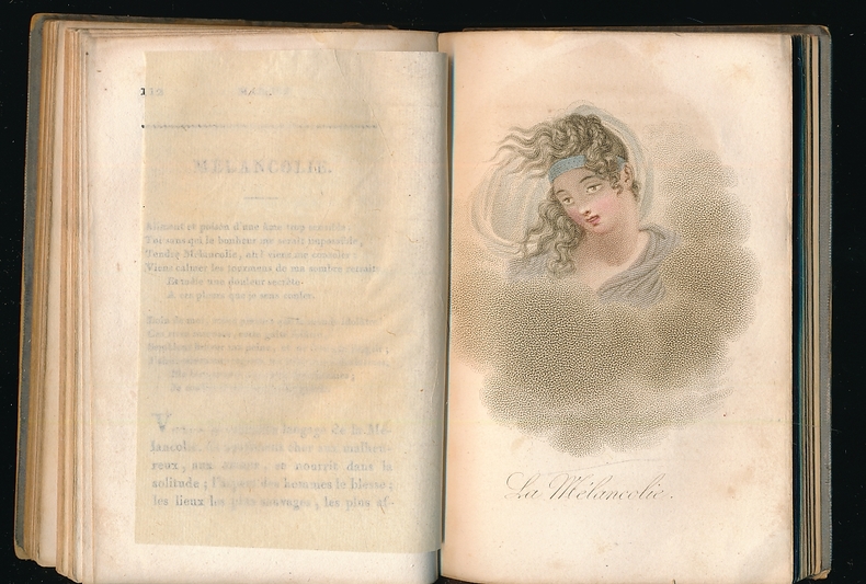 Janet Paris, Janet sans date, 1821. In-16 reliure de toile bleue de l'époque, tranches dorées. XIX + 196 pages. Orné de 12 têtes d'expression en couleurs et hors texte. Vignette couleur en page de titre. Complet du calendrier de l'année 1821 relié en fin. La reliure est abimée avec manque. Charmante étude sur les passions, illustrée par 12 planches finement coloriées : lInnocence, la Modestie, la Malice, la Coquetterie, la Fierté, la Colère, la Compassion, la Satisfaction, la Mélancolie, la Douleur, lAffliction, la Jalousie