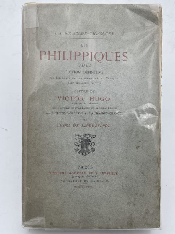 Édition définitive collationnée sur un manuscrit de l'époque. Comprend : dédicace de l'auteur à Victor Hugo, 1 pp ; lettre de V.Hugo à l'auteur, 2 pp ; réponse à V.Hugo, 6 pp - Le Régent, 7 à 130 - Chancel De Lagrange, 133 à 240 - Les philippique , Odes première à sixième, 243 à 468 - une strophe inédite de l'Ode 5ème, 469 à 480 - La princesse de Conti, protectrice de La Grange, 483 à 502 - Sursum Corda, 505 à 512 - notes, 514 à 520 - Table. Joseph de Chancel, dit La grange Chancel, né à Château d'Antoniat, 16777/1758, élève de Racine, fut le protégé de la princesse de Conti. Exilé en Périgord pour s'être brouillé avec le duc de La Force, il participe aux conciliabules de Sceau et à la conspiration de Cellemare qui avait pour objet de renverser le Régent. C'est à cette occasion qu'il compose les philippiques, trois satires contre le Duc d'Orléans, virulents pamphlets en vers ou il se livre aux accusations les plus horribles. Pourchassé et arrêté, il sera enfermé aux iles sainte-Margueritte, d'ou il s'évadera pour l'Italie ou il rédigera une quatrième philippique. Il rentrera en France à la mort du Régent. bel exemplaire , bien relié