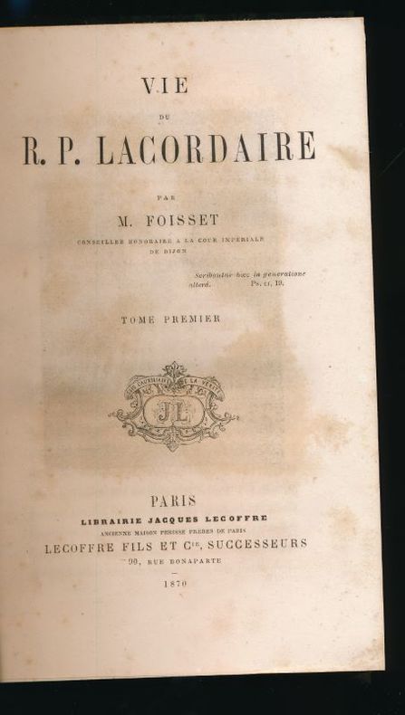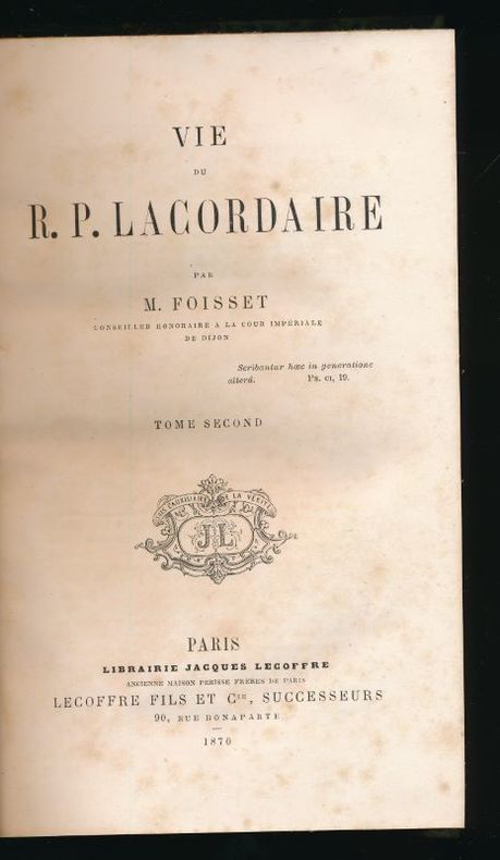 Paris, Lecoffre 1870 Complet en 2 tomes: vii + 586 + 556pp.+ 1 portrait, belles reliures cart.avec dos en cuir