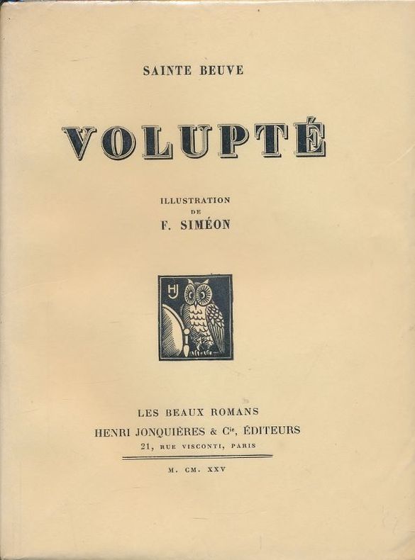 Titre : Volupté Auteur : Sainte-Beuve Charles-Augustin Illustrations : Gab. Ryan (10 hors-texte) Éditeur : Éditions Athéna Collection : Athéna-Luxe Lieu : Paris Date d'édition : 1946 Format : In-8 Reliure : Demi-cuir à coins, dos à nerfs titré or, plats de papier marbré vert Langue : Français Tirage : 2000 exemplaires numérotés. Exemplaire n° 1187 Description : Belle édition de la collection Athéna-Luxe, illustrée de 10 hors-texte de Gab. Ryan. Impression soignée, typographie en rouge et noir, lettrines et culs-de-lampe État : Frottements d'usage, coiffe supérieure émoussée avec petit manque, coins émoussés, plats avec décolorations ; papier uniformément jauni avec quelques rousseurs éparses. Reliure solide, intérieur propre