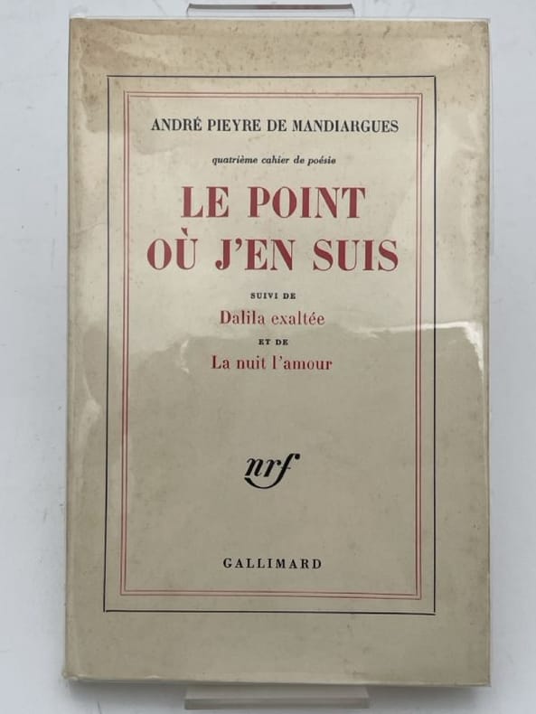 Paris, Éditions Gallimard, Collection NRF, 1964, 1 vol. (18,7 x 12 cm), sous-titré 'quatrième cahier de poésie'. 111 p. dont la table des chapitres, suivies d'un f. de liste de textes du même auteur et d'un f. d'achevé d'imprimer et de justification. Avec un portrait photographique en frontispice. Édition originale numérotée : exemplaire n° 1024 sur vélin bouffant de papeteries de Condat, après 25 exemplaires sur vélin de Hollande van Gelder et 60 exemplaires sur vélin pur fil Lafuma-Navarre. André Pieyre de Mandiargues (1909-1991) : poète français.