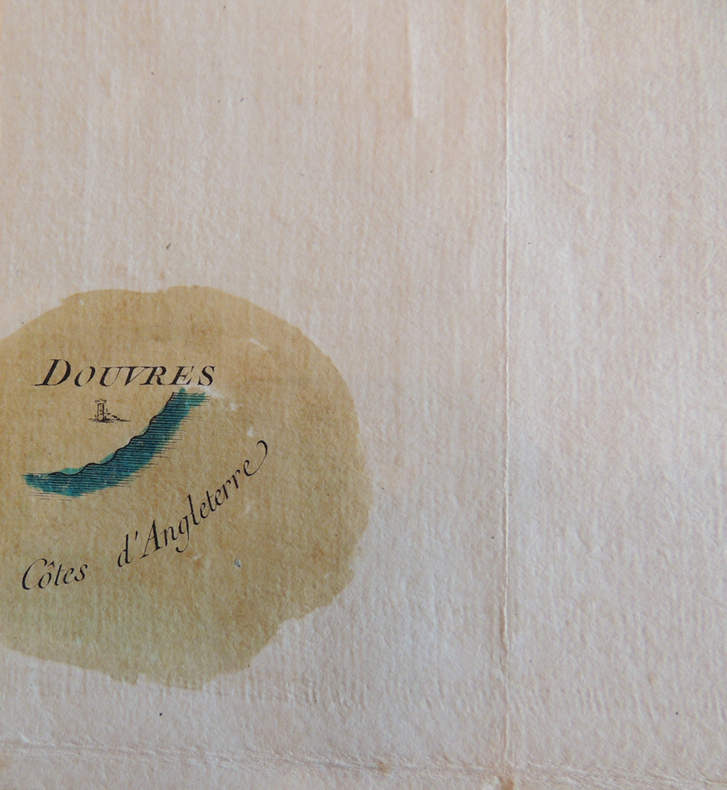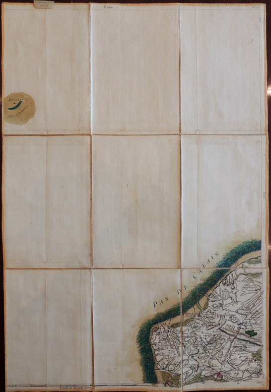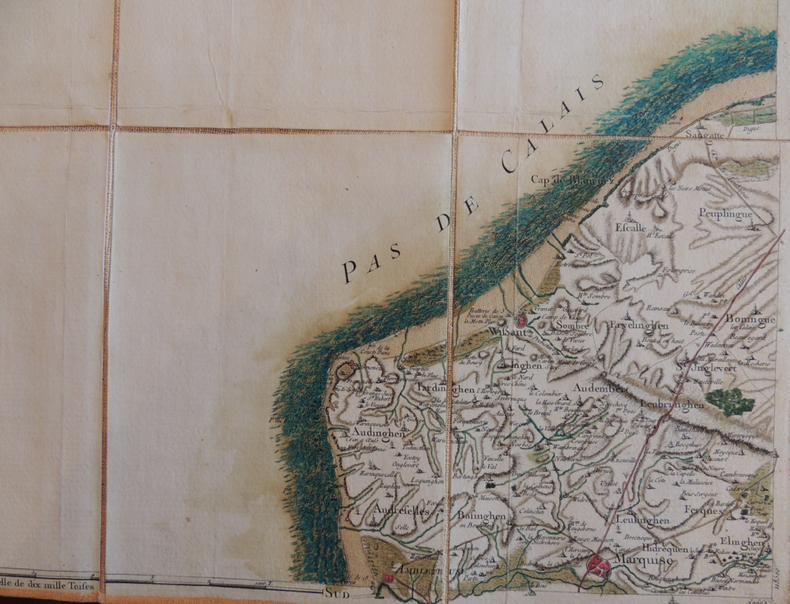 . Chez Picquet, géographe ordinaire du roi Paris, vers 1780, une feuille (39x58 cm la feuille) de la carte «générale et particulière de la France» de Cassini. La feuille est repliée en 9 sections marouflées sur toile. Cette feuille est en délicats coloris. Cette carte fut publiée entre 1756 et 1815 dont le tirage était de 200 à 500 exemplaires selon les feuilles. Les exemplaires en beaux coloris dépoque sont rares. La carte de Cassini (des Cassini devrait-on dire puisque plusieurs générations de géographes du même nom se sont succédées dans cette entreprise.) est la première carte française réalisée par triangulations primaires et secondaires à partir de relevés géodésiques ce qui lui confère la plus grande précision possible techniquement pour l'époque. Superbe, en parfaite condition. Chaque feuille rectangulaire couvre 40 000 toises sur 25 000 (une toise pour 1,94 904 mètres et une ligne pour 100 toises soit 80 kilomètres sur 50 environ) à léchelle du 1/86 400 e. Superbes coloris anciens.