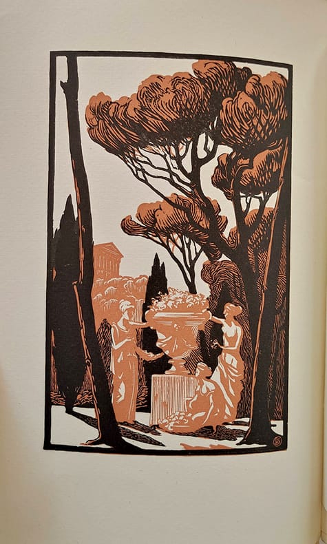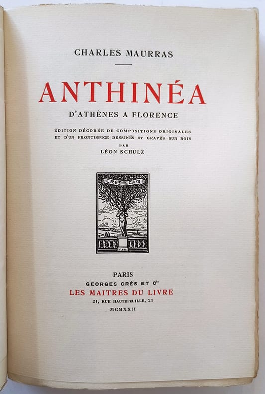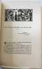 Georges Crès et Cie "Paris, 1922, collection ""Les Maîtres du livre"", in-8 broché, couverture rempliée, XIV-282pp.-1f. Edition décorée de compositions originales et d'un frontispice dessinés ett gravés sur bois par Léon Schulz. Exemplaire numéroté sur papier de Rives. Très bon état."
