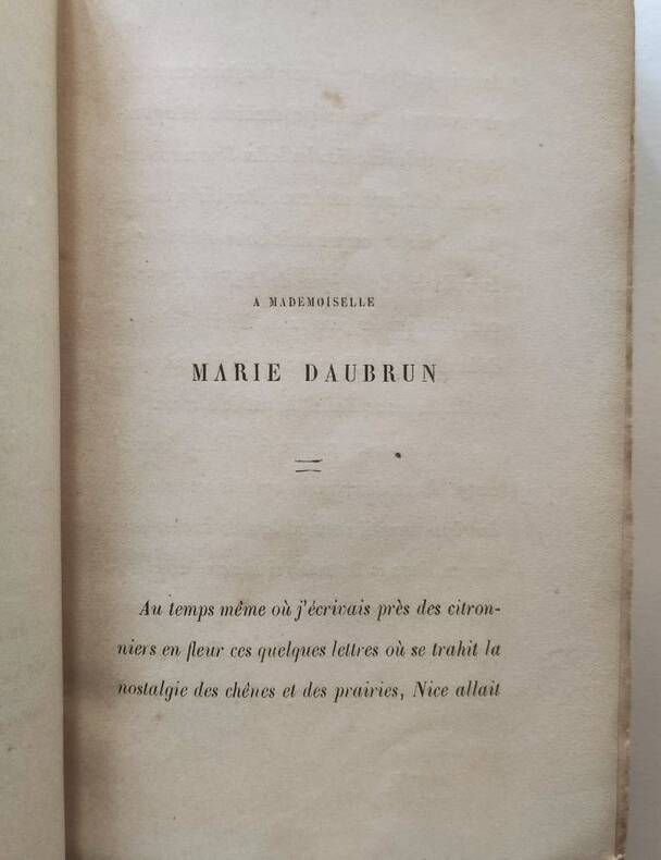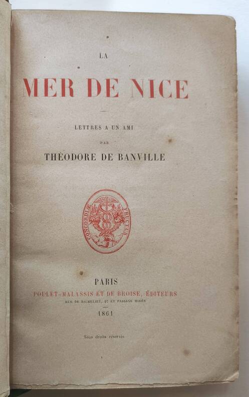 Poulet-Malassis et de Broise "Paris,1861, in-12 demi-veau blond, dos orné à cinq nerfs plats, date en queue, tête dorée. Les couvertures de brochage n'ont pas été conservées. Reliure début Xxème. 6ff.-224pp. Vicaire I-267 Edition originale / Clouzot 34 ""Assez recherché"" / Oberlé N°168. Bel exemplaire de cet ouvrage à la gloire de Nice, publiée l'année de l'annexion de Nice à la France. Oberlé n'hésite pas à qualifier l'ouvrage de ""chef-d'oeuvre, un chef-d'oeuvre méconnu qui ne fut jamais réedité (sauf pour deux éditions confidencielles des années 30)"". Les fins gourmets y trouveront l'authentique recette de la bouillabaisse ! L'ouvrage est dédié à Marie Daubrun qui avait inspiré l'Invitation au voyage de Baudelaire."