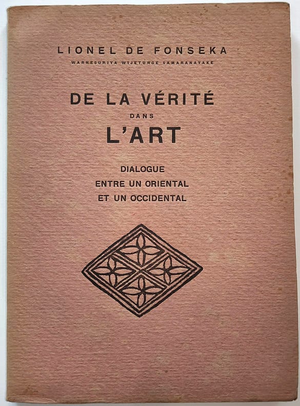 Publication Chitra, C.A. Högman Editeur / Librairie des lettres et des Arts Paris, 1930, in-12 carré, premier plat orné d'une figure gravée sur bois. VI-139pp.-1f. Réflexion sous forme de dialogue sur la disparition de l'art cingalais, et oriental sous l'influence du commerce et des idées occidentales amenées par les anglais. Parfait état. Ouvrage peu courant, surtout en français dont la première publication date de 1912. Lionel de Fonseka (né en 1889), cingalais, étudie au Royal Collège de Colombo et à l'université d'Oxford. De la vérité dans l'art est son premier ouvrage rédigé en français avant d'être traduit en anglais.
