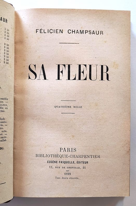 Bibliothèque Charpentier / Eugène Fasquelle Editeur "Paris, 1899, mention de quatrième mille, in-12 demi-basane caramel, dos à quatre nerfs, pièce de titre de cuir brun, fers au dos. 3ff.-292pp.-1f. Rachilde, Mercure de France janvier 1899 : ""Ça ne change jamais de note, le Champsaur et, en somme, il fait ses livres lui-même celui-là, on lui doit un bon point. Il s’agit toujours d’un gendelettre à forte carrure, belles épaules de dompteur, large poitrine, œil de velours, moustache de hussard, allure de grande distinction, fait des romans à clef ou des pièces à sensation, tient le boulevard sur son petit doigt et toutes les femmes sur son cœur. Les jeunes vierges viennent lui offrir… des fleurs et il prend, ou ne respire même pas, selon qu’on tire à la ligne ou qu’on aime à couper court. Bref, ça doit se vendre comme du pain, ça devient presque nécessaire à l’existence, quoi ! Moi, je m’y habitue : si je n’en n’avais pas un dans ma mensuelle collection, ça m’embêterait."" Bon exemplaire."