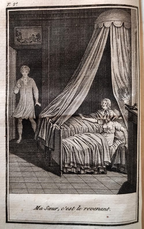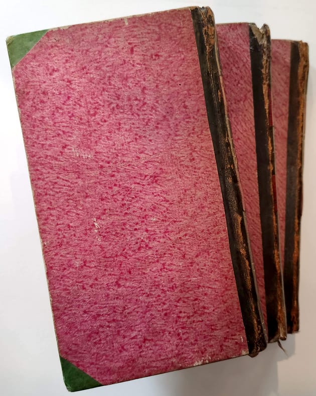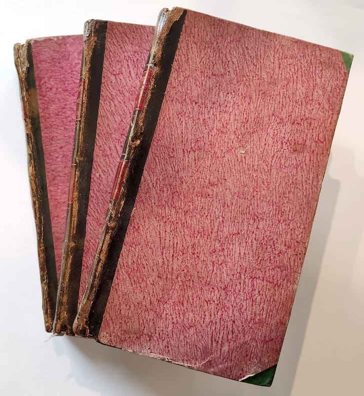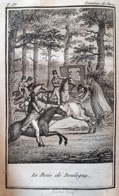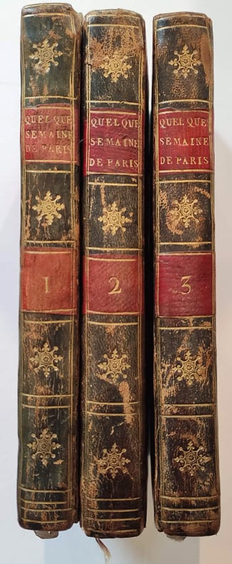 Chez Maradan, libraire Rue Pavée - Saint André des arts N°16 "Paris, An IX (1800-1801), 3 vol. in-12 demi-basane verte, dos rond sans nerfs, pièces de titre et de tomaison de cuir rouge. Filets et fers dorés, plats de papier à la colle rose, coins de vélin vert, tranches jaunes. Reliure de l'époque. Frontispice-2ff.-197pp. / Frontispice-2ff.-213pp. / Frontispice-2ff.-207pp. Le frontispice du T.Ier est signé Bovinet. Edition originale illustrée de trois frontispices. Monglond V, 518 ""il s'agit d'un d'un roman dont l'action se déroule dans les derniers temps du Directoire et qui se termine par une apologie du 18 Brumaire. L'intrigue sert à relier de petits tableaux de Paris. "".- Lacombe, Bibliographie parisienne, 410, indique An XI pour l'An IX ""Cette composition est assez libre, d'un style fade et sentant son temps, contient quelques chapitres assez interressants du point de vue parisien."" L'auteur de cet ouvrage est resté à ce jour anonyme. Le frontispice du T.I offre une vision du Bois de Boulogne. Epigraphe : ""Pour corriger les mœurs, il faut les dévoiler"". Ouvrage peu courant. Manques de cuir sur un mors du premier et du deuxième volume. Intérieurs sans rousseur ni mouillure."