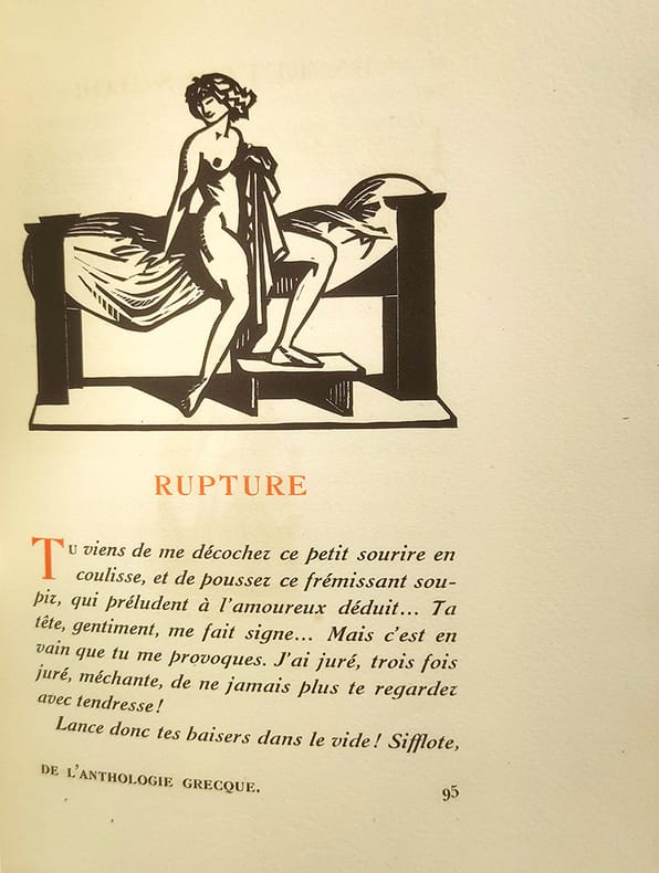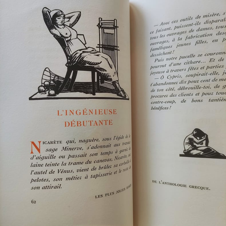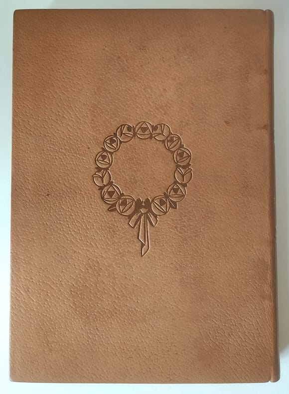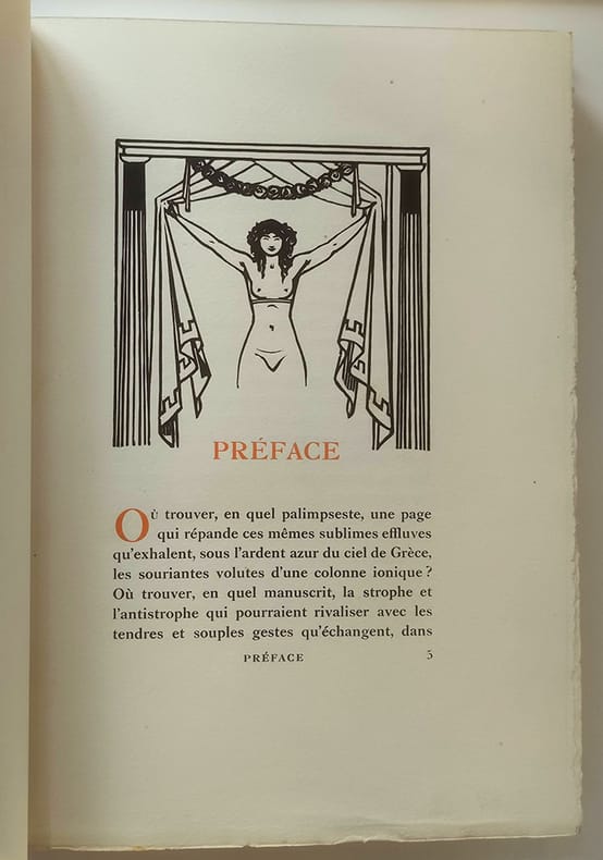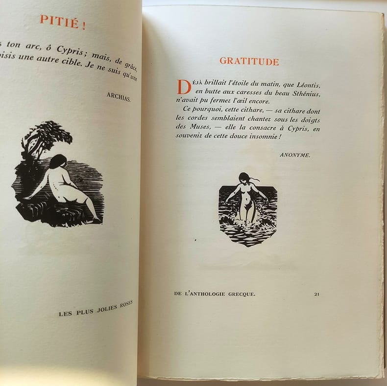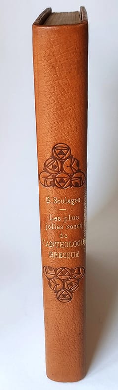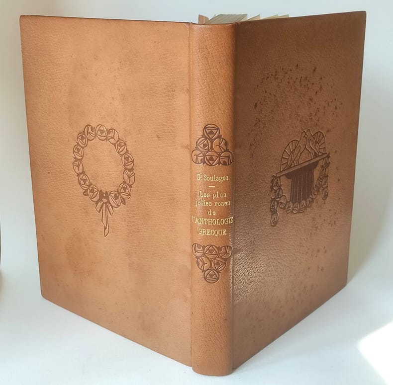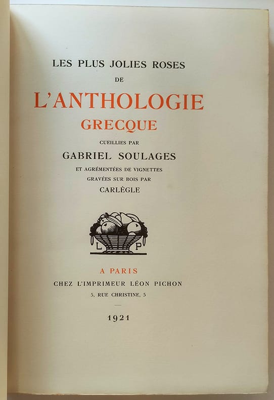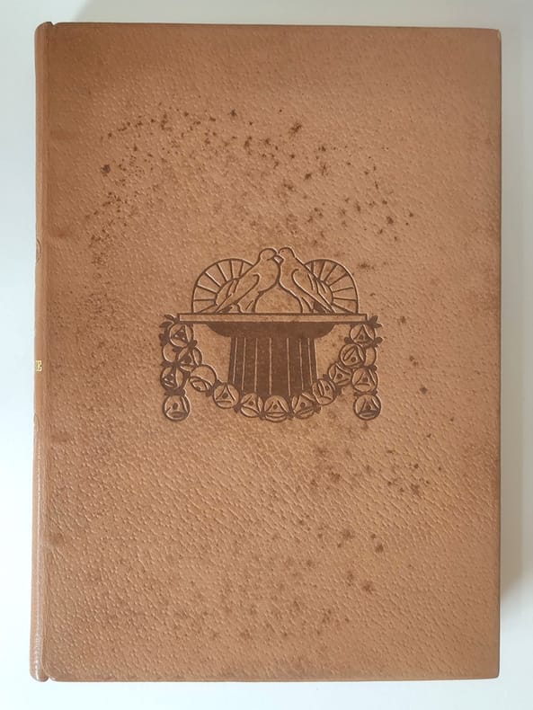 Chez l'imprimeur Léon Pichon Paris, 1921, petit in-4 plein chagrin maroquiné havane, dos rond, titre doré encadré de roses stylisées à froid, décors à froid sur les plats (deux colombes sur un fût de colonne sur le premier et une girlande de roses sur le second, couvertures et dos conservés. tête dorée. Reliure signée Kieffer. 214pp.-2ff. Vignettes gravées sur bois et tirées en noir par Carlègle. Un des 450 exemplaires sur vélin à la cuve des papeteries d'Arches. Piqûres sombres sur le cuir du premier plat sinon bel exemplaire, sans rousseur.