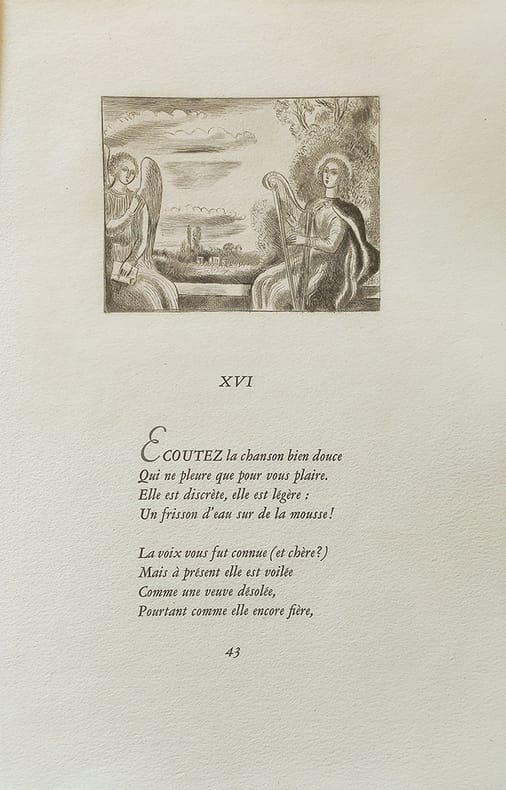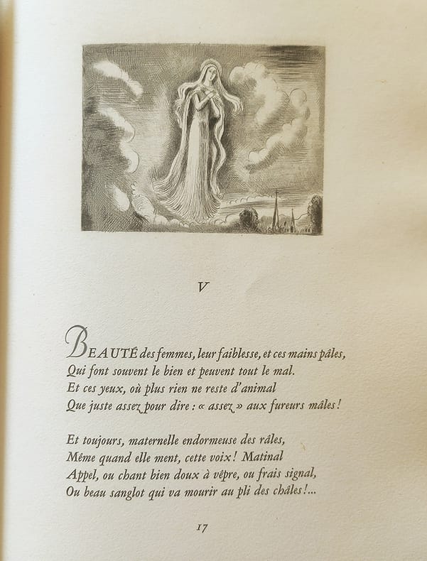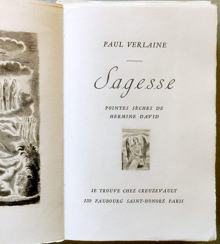 Se trouve chez Creuzevault, 159 Faubourg SaintHonoré Paris, 11 novembre 1943, in-8 en feuilles sous couverture rempliée illustrée d'une gravure, chemise et étui. 128pp-9ff. 53 Pointes-sèches de Hermine David (dont une en couverture). Tirage à 450 exemplaires, un des 380 ex. sur Arches. Les illustrations de cette édition diffèrent de celle publiées chez le même éditeur en juillet de la même année. Très bon état.