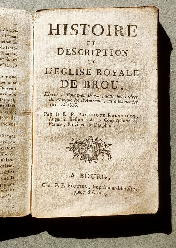 "Chez P.F. Bottier, imprimeur libraire ; place d'armes" "A Bourg, sd (1767 ?), in-12 broché, 143pp., couverture d'attente muette de papier chamois. Bois gravé au titre (corbeille de fruits) et en bandeau du chapitre premier (vue d'architectures). Cerne d'eau en bordure et angle inférieur des quarante dernières page. Une édition a été donnée en 1767 (avec date), chez Desaint à Paris et Chez Comte à Bourg-en-Bresse, une ""seconde"" édition a été donnée en 1806 (avec date au titre) chez Bottier, à Bourg. Notre édition, sans date, est souvent donnée comme l'édition originale de l'ouvrage. Bien que l'éditeur et le fleuron du titre soient identiques à l'édition de 1806, la comparaison des exemplaires montre des différences notables dans la composition du texte, la numérotation des pages, les caractères typographiques (y compris à la page de titre) ou les ornements typographiques. Il paraît donc difficile de dire s'il s'agit ici véritablement de la première édition ou d'une édition intermédiaire entre celle de 1767 chez Comte et celle de 1806 chez Bottier. Elle est néanmoins fort rare dans sa simplicité d'édition provinciale. Quérard, La France Littéraire, VIII-240 indique que ce ""petit ouvrage est plein de recherches curieuses"" mais donne la date de 1724 par erreur. (l'approbation est datée de 1767). "