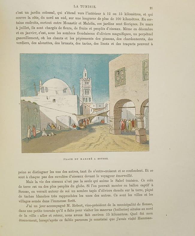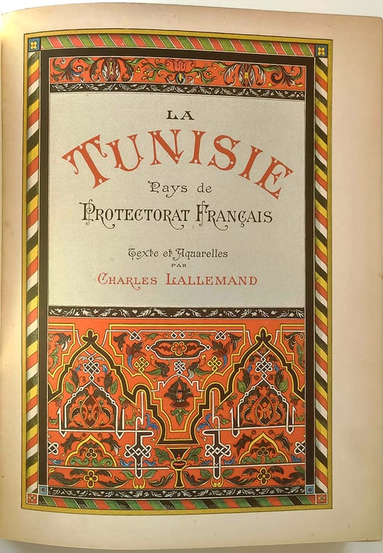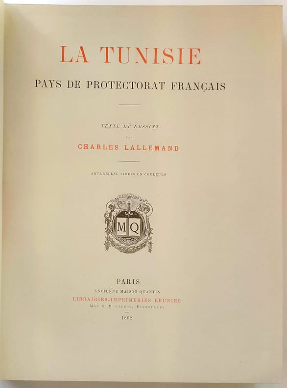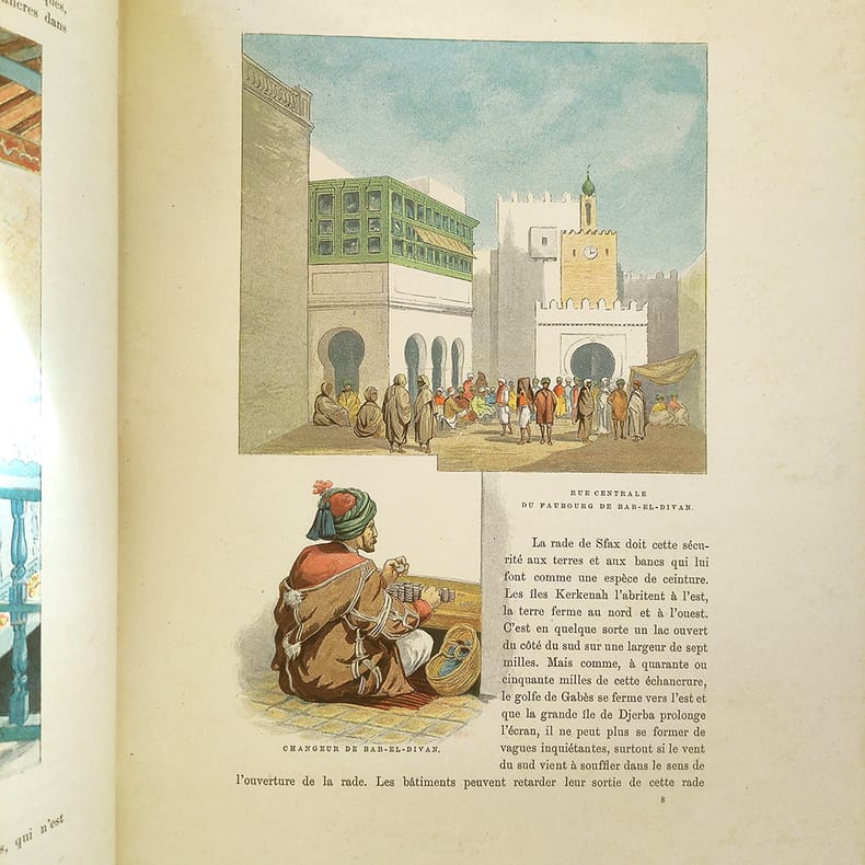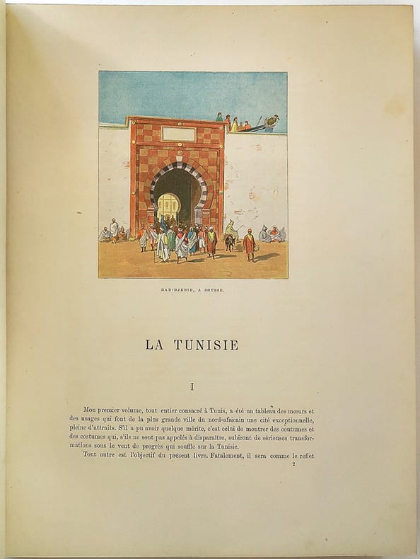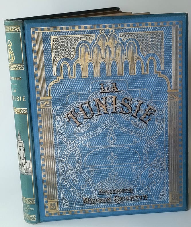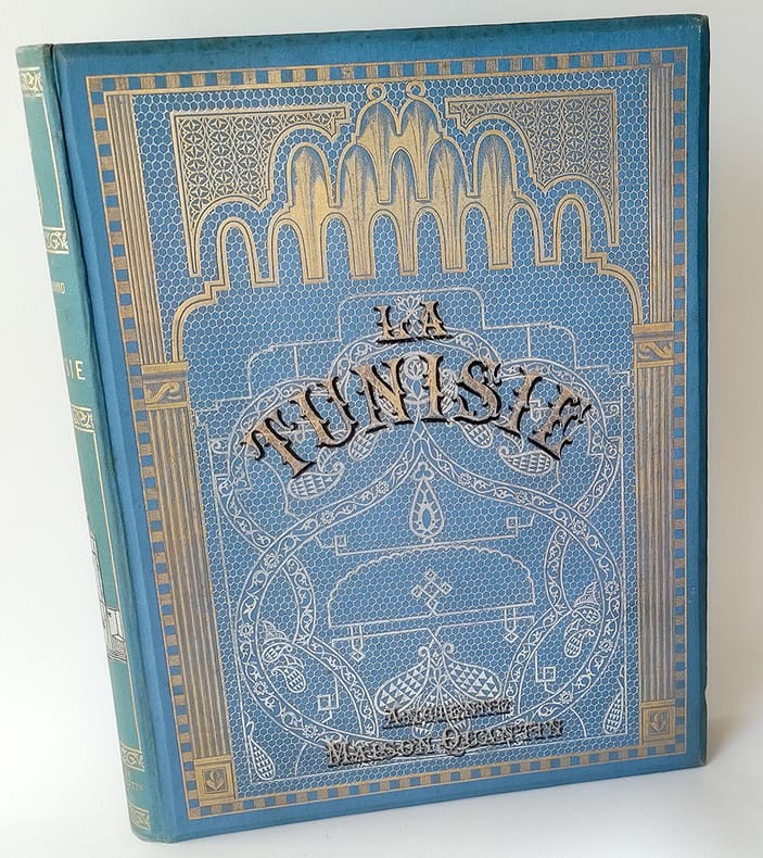 Ancienne maison Quantin / Librairies-Imprimeries réunies / May et Motteroz directeurs Paris, 1892, grand in in-4 pleine percaline éditeur bleue décorée à l'or et l'argent de motifs architecturaux. Couvertures de brochage et dos illustrés en couleurs conservés. Toutes tranches dorées. 254pp. Très nombreuses aquarelles de l'auteur reproduites en couleurs, parfois à pleine page. Bien complet de la carte sur double page in fine. Sousse. L'olivier. Monastir. Lemta. Moukenine. Mahdia. Kapoudiah. Sfax. De Gabès à Sfax. Gabès. Djara. Très bel exemplaire parfaitement conservé dans son cartonnage éditeur et au papier bien frais. On trouve à la fin de l'ouvrage une table des vignobles tunisiens en 1892. Le dos est très très légèrement éclairci.
