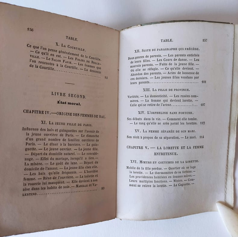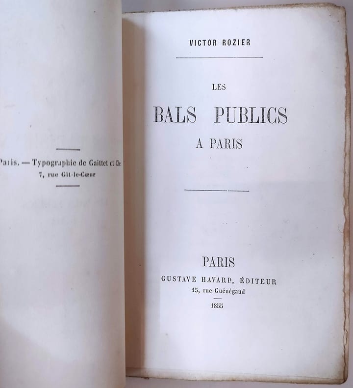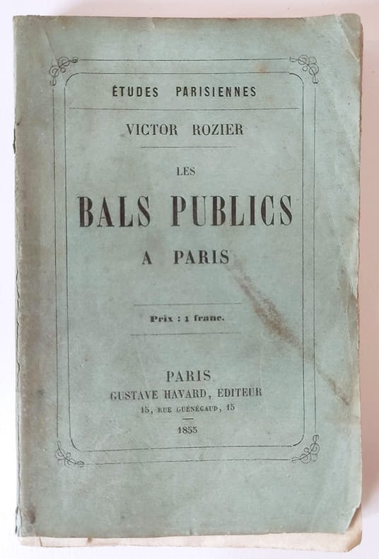 Gustave Havard "Paris, 1855, collection Etudes parisiennes, in-16 broché, 158pp. Edition originale sur un beau papier vélin. ""Utile à consulter, contenant les lois et ordonnances des bals, ainsi que de nombreux détails historiques."" Desrat, Dictionnaire de la danse historique, théorique, pratique et bibliographique. / Gay, Bibliographie des ouvrages relatifs à l'amour p.675-676. Si la première partie de l'ouvrage est consacrée à L'état physique des Bals (tableaux des bals, législations, origine du luxe dans les bals, de l'affiche des bals publics, les bals disparus, le quartier latin), la seconde partie de l'ouvrage est consacrée à l'état moral des bals (les femmes des bals, leurs origines, les lorettes et les différentes formes de protitutions que l'on trouve dans ces bals.) Légères salissures sur la couverture, intérieur bien blanc."