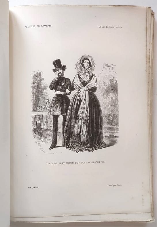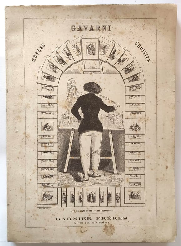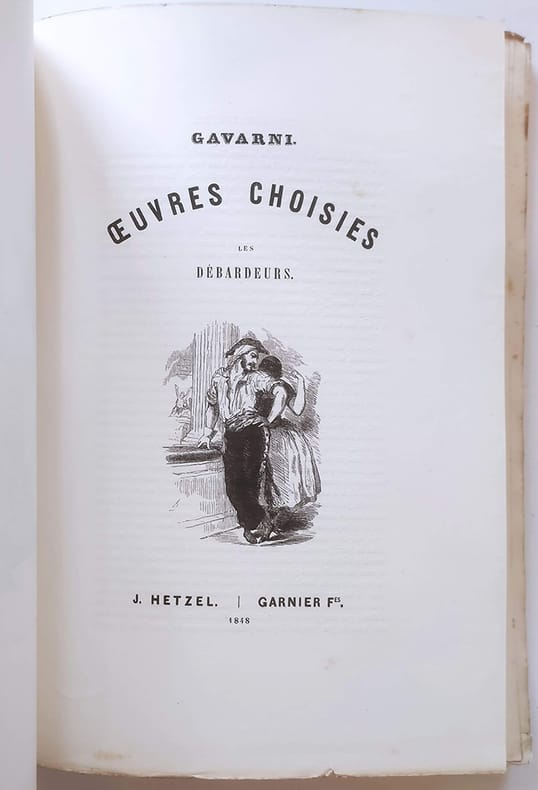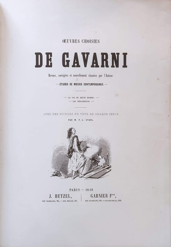 J. Hetzel / Garnier Frères "Paris, 1848, in-4 broché, couverture illustrée, 4ff.-30 planches / 2ff.-50 planches-2ff. (table et publications de l'éditeur.) Les notices sont de P.J. Stahl, pseudonyme de Jules Hetzel. Vicaire III-954 / Carteret III-260 / Brivois 168. Il s'agit de la quatrième et dernière série de ces oeuvres choisies. ""Ouvrage important à gravure sur bois, présentant une oeuvre originale dessinée à nouveau par l'artiste d'après ses lithographies. L'ensemble donne bien une idée du talent de Gavarni et des mœurs de son temps."" Premier tirage des gravures. Piqûres sur la couverture et quelques rousseurs éparses mais dans l'ensemble le papier est bien blanc. Cette condition brochée n'est pas courante. La figure de couverture représente Gavarni de dos en train de dessiner à la plume."