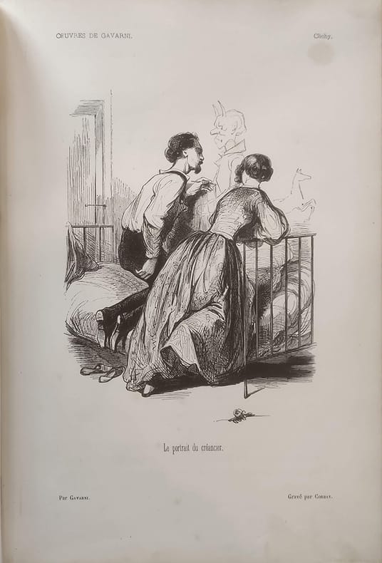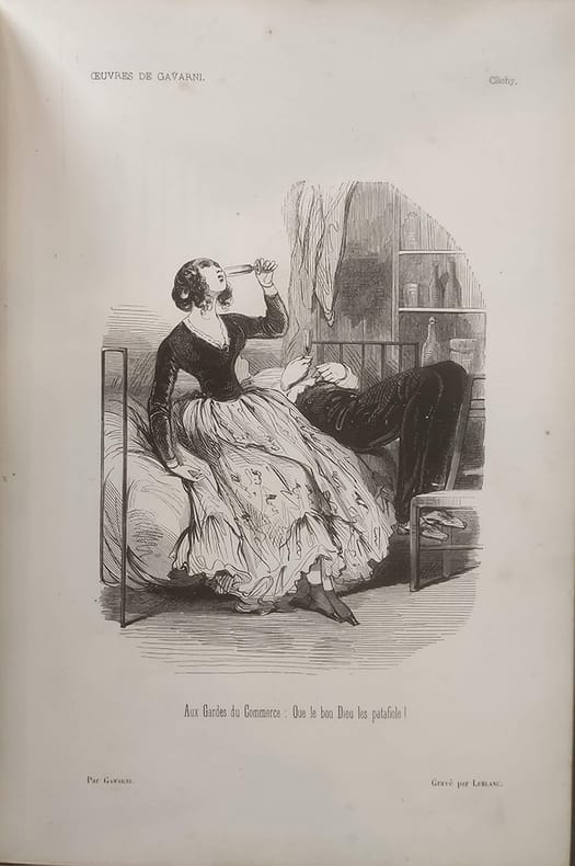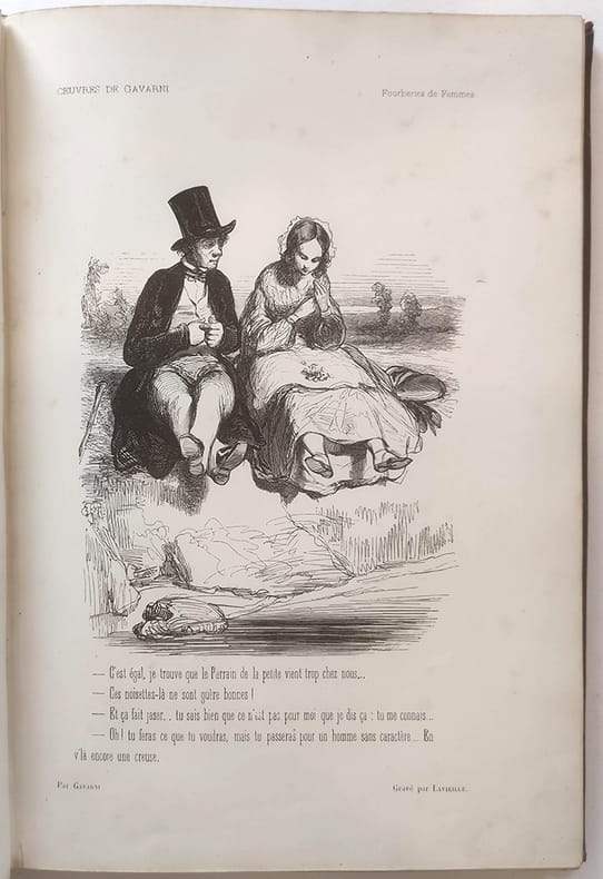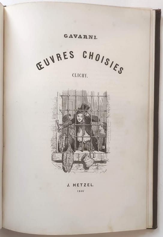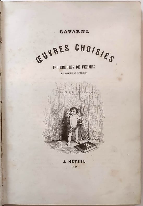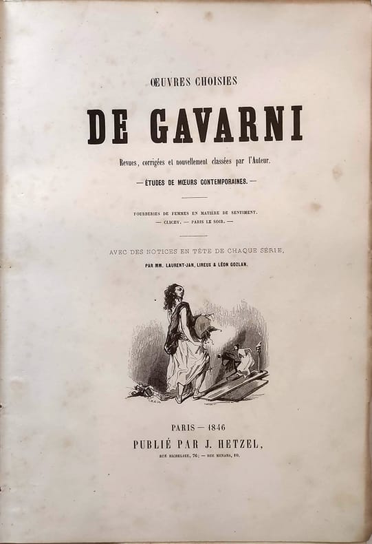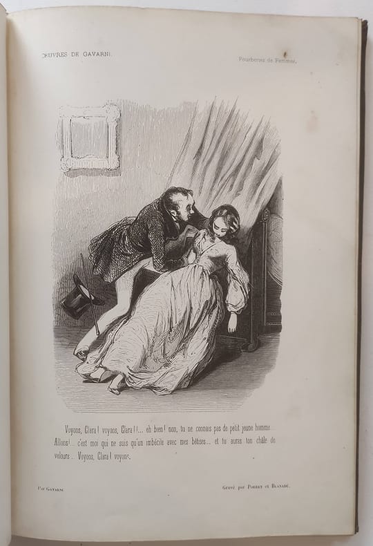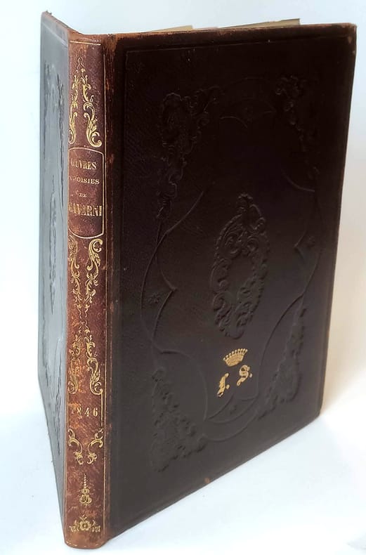 J. Hetzel "Paris, 1846, in-4 plein chagrin dos rond orné de fers dorés, plats décorés de grands fers à froid. Toutes tranches dorées. Le premier plat porte les initiales ""L.S"" surmontées d'une couronne comtale.Fourberies de femmes 4ff.-48 planches / Clichy 2ff.-19 planches / Paris le soir 2ff.-13 planches-2ff. (table + publication Hetzel). Vicaire III-953 / Carteret III-260 / Brivois 160. Il s'agit de la deuxième série de ces oeuvres choisies. ""Ouvrage important à gravure sur bois, présentant une oeuvre originale dessinée à nouveau par l'artiste d'après ses lithographies. L'ensemble donne bien une idée du talent de Gavarni et des mœurs de son temps."" Premier tirage des gravures. Quelques légères rousseurs mais dans l'ensemble le papier est bien blanc. Frottement à la reliure."
