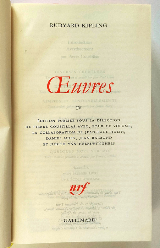 nrf / Gallimard Bibliothèque de la Pléiade "Paris, 2001, reliure plein cuir éditeur sous rhodoïd (pas de boitier imprimé),LVII-1460pp. Contient : Diverses créatures / Dettes et créances / limites et renouvellements / Récits autobiographiques : La France en guerre - Souvenirs de France - Quelques mots sur moi. Appendice : mon premier livre - Une école anglaise - ""Stalky"" - La satisfaction d'un gentleman. Très bon état."